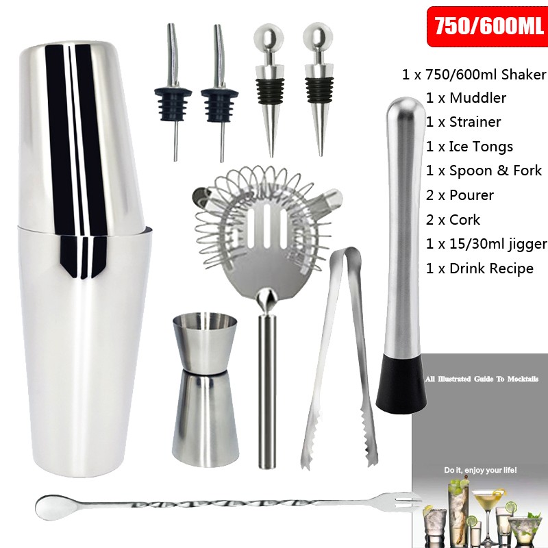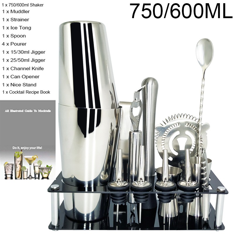 1x750/600ml 칵테일 셰이커, 1 x 아크릴 스탠드, 1x15/30ml, 1x25/50ml, 4 x 거꾸로 된 스토퍼, 1 x 머들러, 1 x 아이스 집게, 1 x 바 스푼, 1 x 코르크 스크류, 1 x 캔 오프너, 1 x 칵테일 레시피, 1 x 스트레이너.