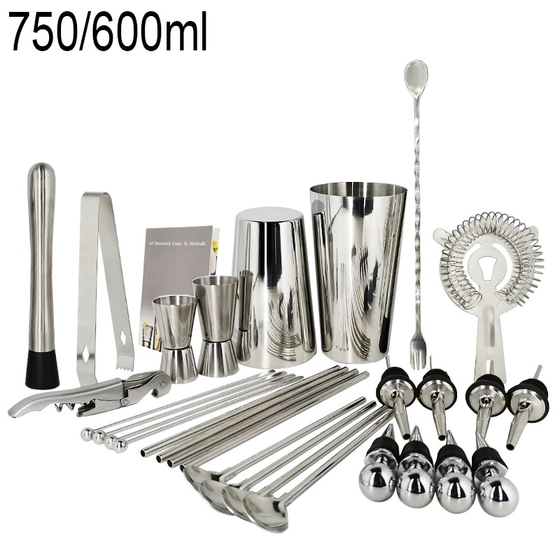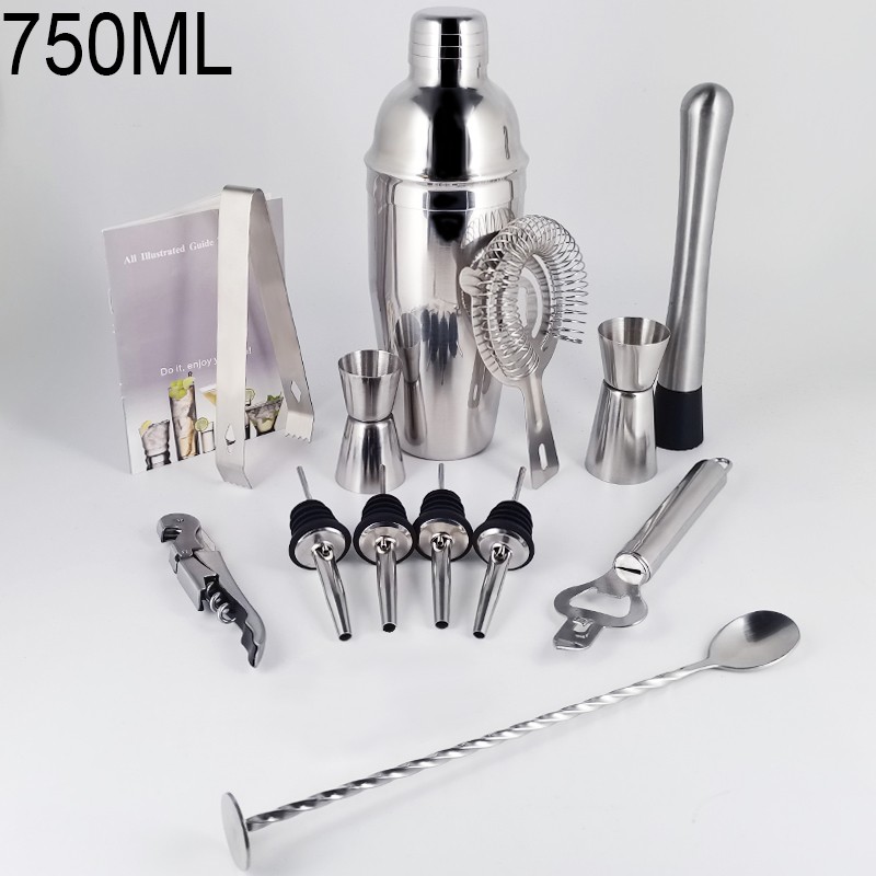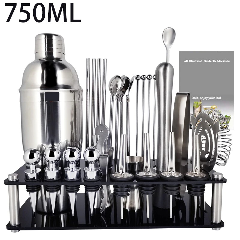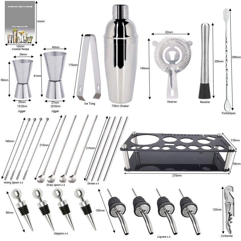 1x750ml 칵테일 셰이커, 1 x 아크릴 스탠드, 1x15/30ml, 1x25/50ml, 4 x 거꾸로 된 스토퍼, 1 x 머들러, 1 x 아이스 집게, 바 스푼 1 개, 코르크 스크류 1 개, 캔 따개 1 개, 칵테일 레시피 1 개, 스트레이너 1 개.