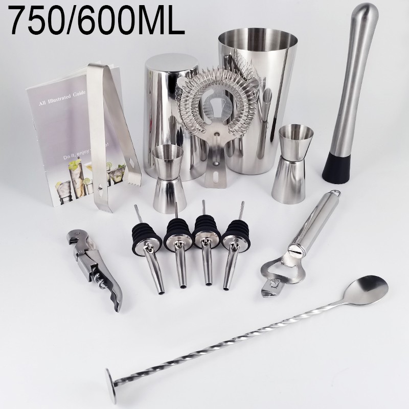 1x750/600ml 칵테일 셰이커, 1x15/30ml, 1x25/50ml, 4 x 거꾸로 된 스토퍼, 1 x 머들러, 1 x 아이스 집게, 바 스푼 1 개, 코르크 스크류 1 개, 캔 따개 1 개, 칵테일 레시피 1 개, 스트레이너 1 개.