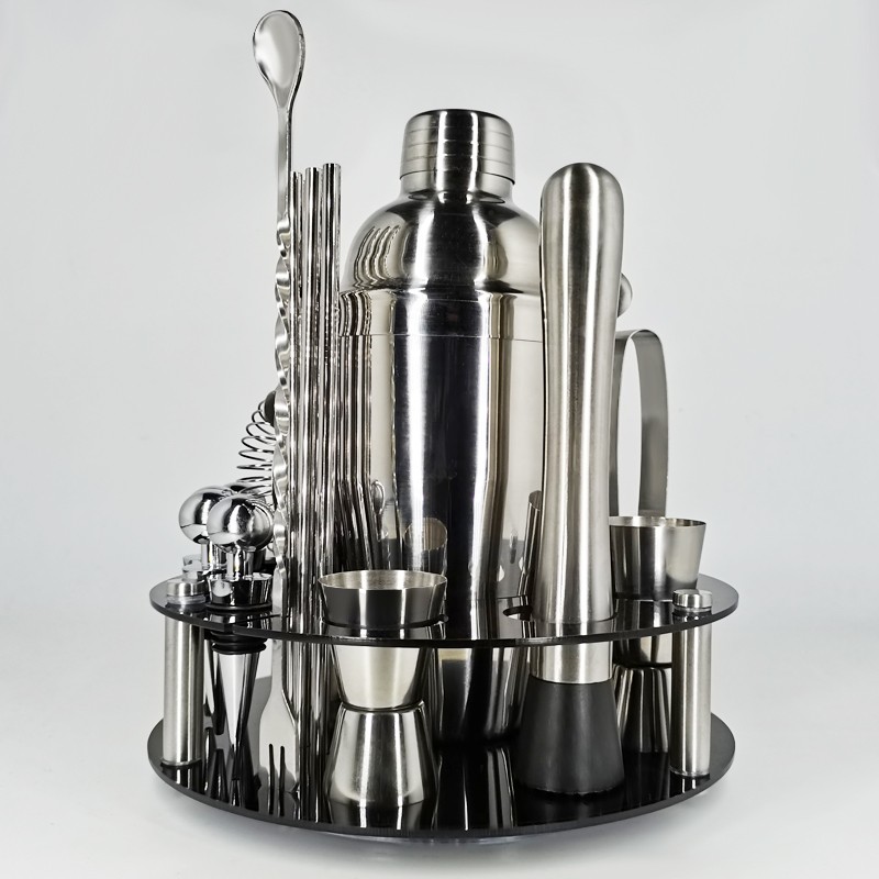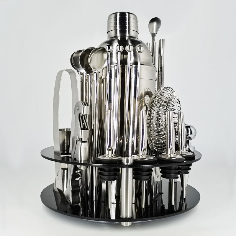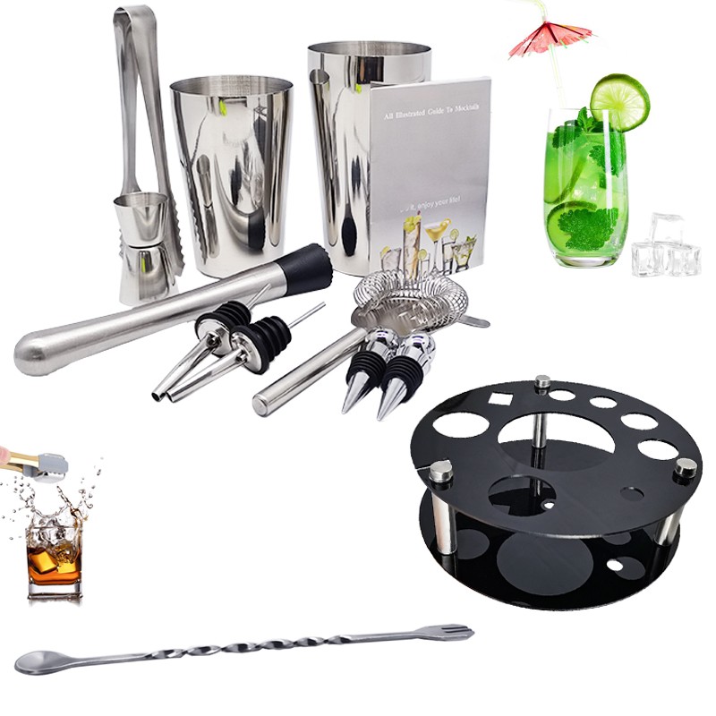 1x750/600ml 칵테일 셰이커, 1 x 아크릴 회전 라운드 스탠드, 1x15/30ml, 1x25/50ml, 4 x 거꾸로 마개, 둥근 와인 스토퍼 4 개, 빨대 4 개, 빨대 스푼 4 개, 교반 막대 4 개, 머들러 1 개, 얼음 집게 1 개, 바 스푼 1 개, 코르크 스크류 1 개, 칵테일 레시피 1 개, 스트레이너 1 개