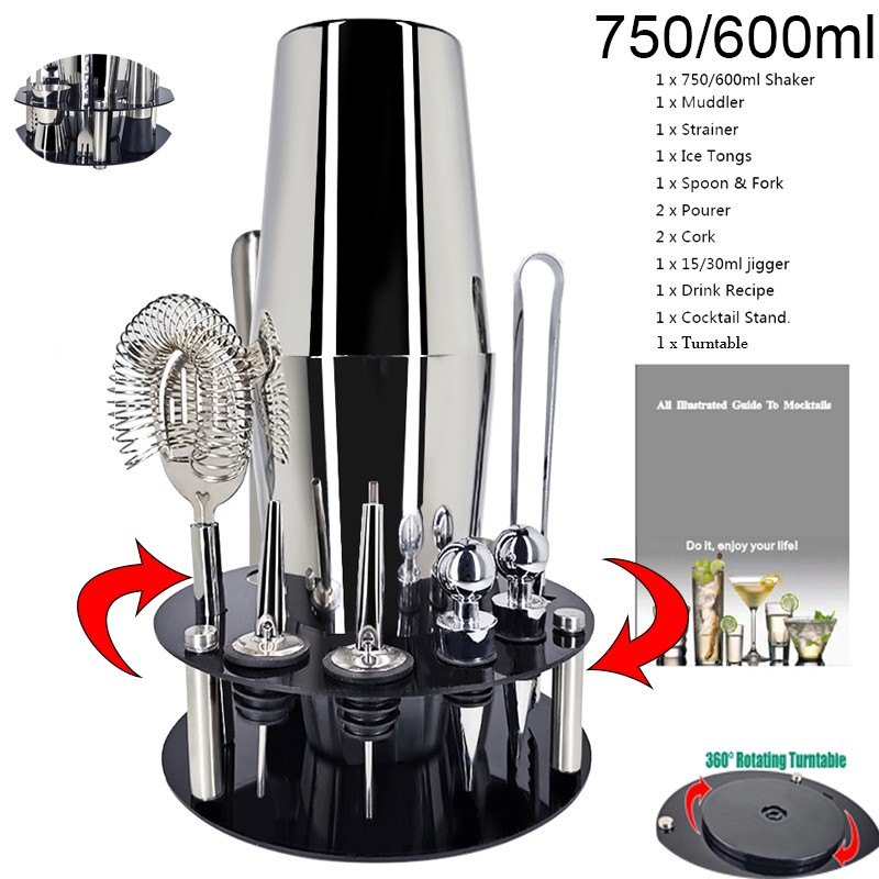 1x750ml 칵테일 셰이커, 아크릴 회전 원형 스탠드 1 개, 15/30ml 1 개, 거꾸로 된 스토퍼 2 개, 원형 와인 스토퍼 2 개, 머들러 1 개, 1 x 아이스 집게, 1 x 바 스푼, 1 x 칵테일 레시피, 1 x 스트레이너.