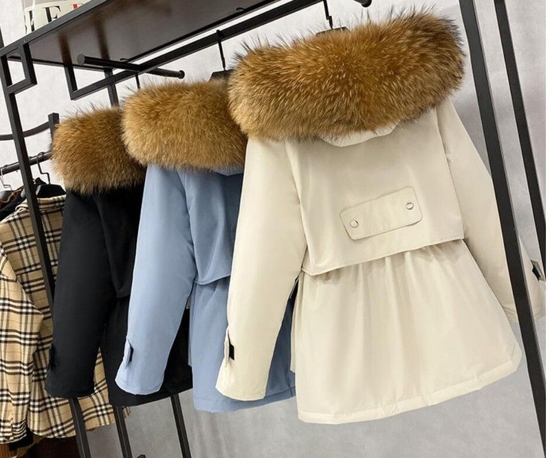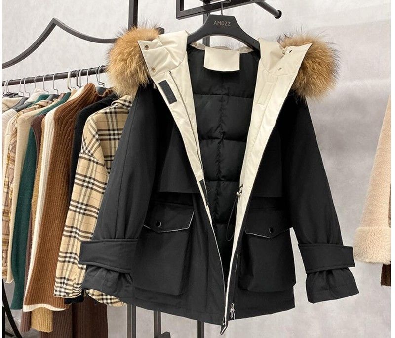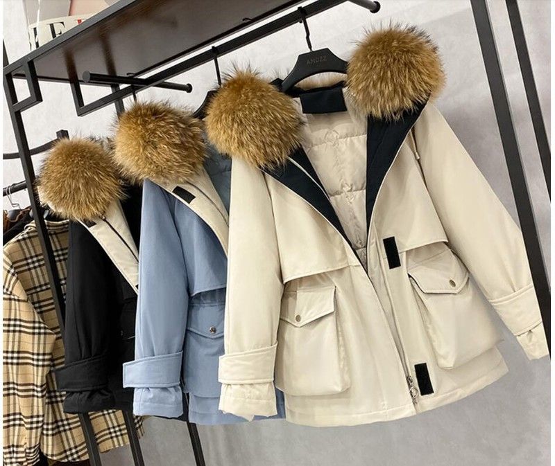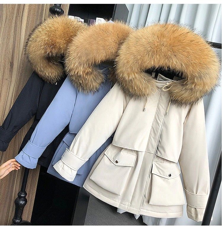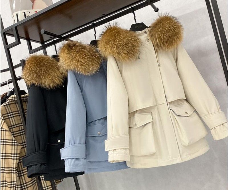 겨울 재킷 여성 모피 칼라 코트 : 겨울 자켓 여성 파카 너구리, 화이트 오리 다운 재킷