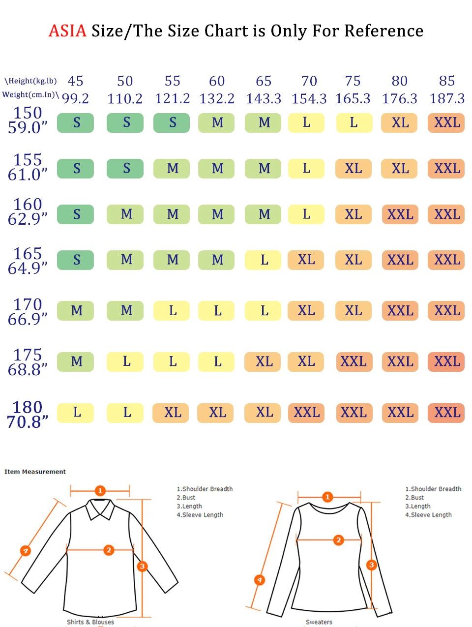 180CM 70.8 | L | L | XL | XL | XL | XXL | XXL | XXL | XXL |