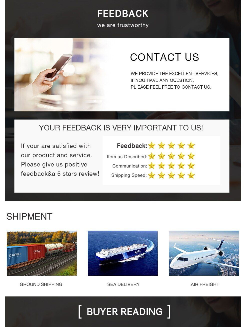2. 귀하의 의견은 귀하의 비즈니스 개발에 매우 중요하기 때문에 귀하가 당사의 제품과 서비스에 만족한다면 진심으로 긍정적 인 피드백을 남기도록 초대합니다. 1 분 밖에 걸리지 않지만이 1 분은 우리에게 매우 중요한 의미를 가지고 있습니다.