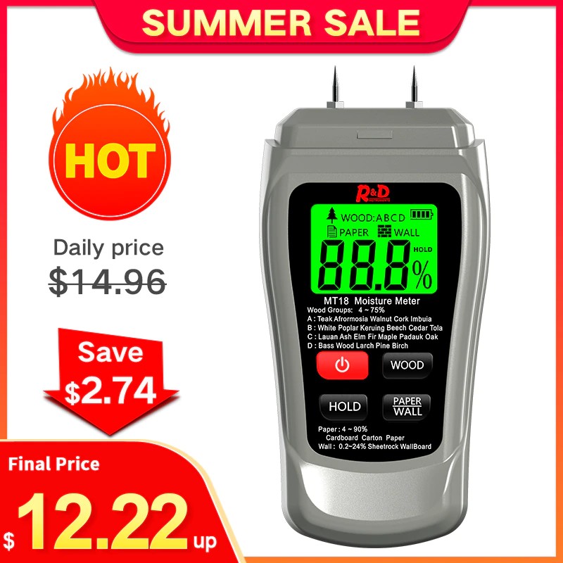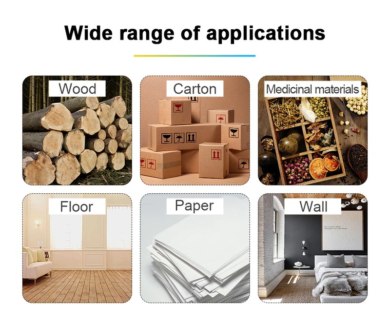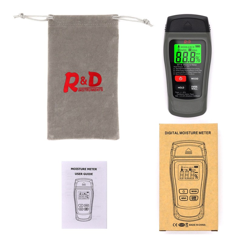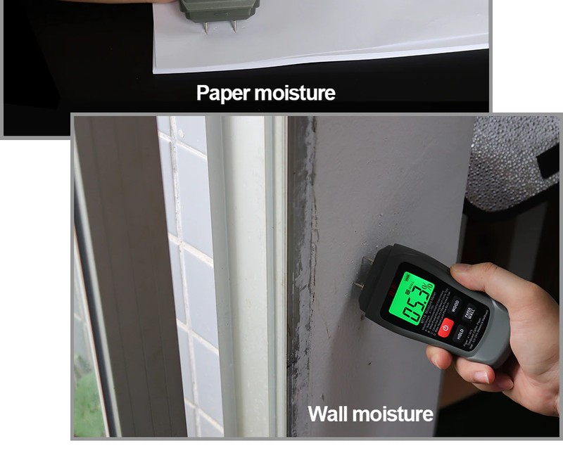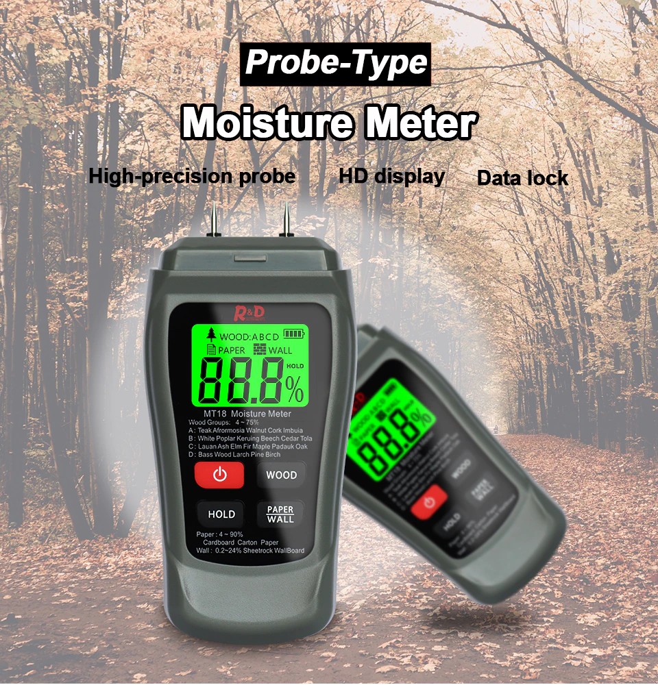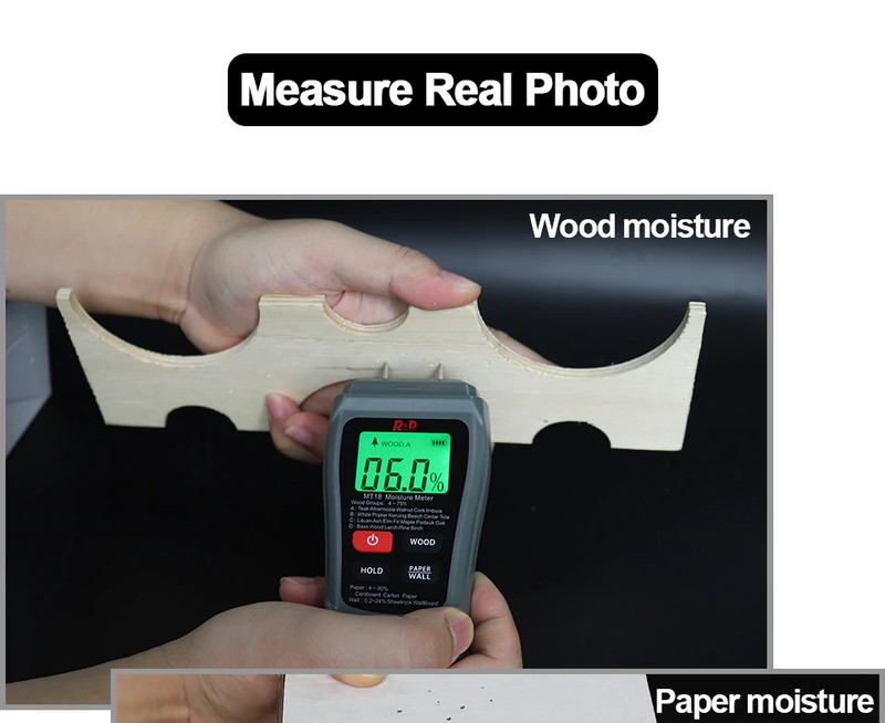 이 기기는 ABCD 목재 저울을 사용하여 사용자가 모든 종류의 목재 종에서 정확한 수분 측정을 할 수 있습니다. 판지, 상자 및 종이의 수분을 테스트하기 위해 종이 모드를 선택할 수 있습니다. 벽 모드를 선택하여 시트 락, 월보드 또는 기타 건축 자재의 수분을 테스트 할 수 있습니다.