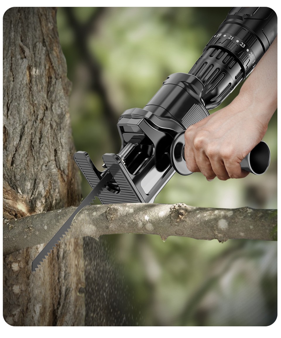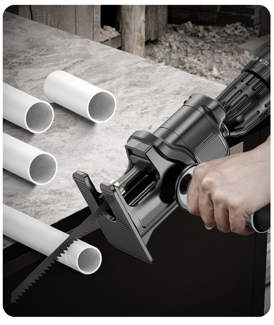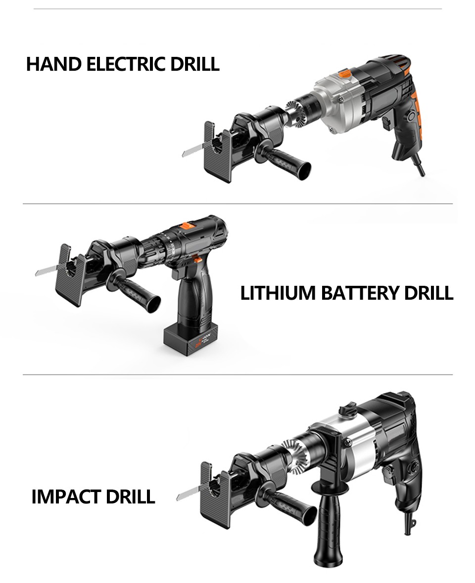 왕복 톱 부착물은 전기 드릴을 왕복 톱으로 변환 할 수 있으며, 대부분의 전기 드릴에 적합한 광범위한 용도로 사용됩니다.