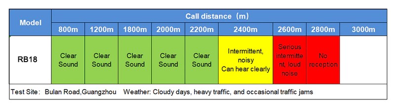 이 테스트는 광저우 Bulan Road에서 수행되었으며 도시 지역에서만 호출 거리였습니다. 실외에있는 경우 상황에 따라 통화 거리가 3-5km에이를 수 있습니다.