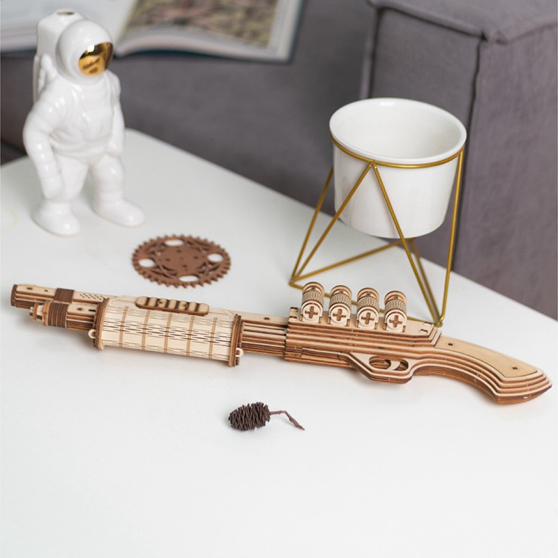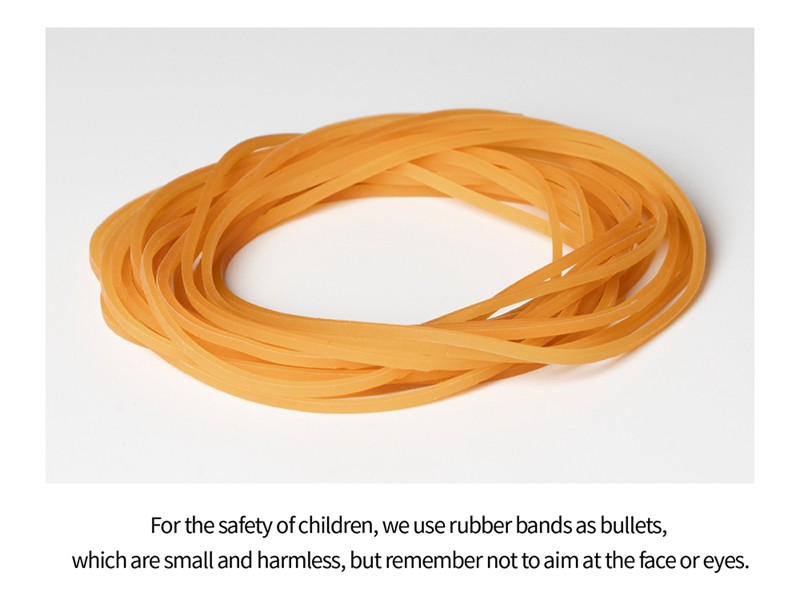 어린이의 안전을 위해, 우리는 무해한 탄알로 고무 밴드를 사용하지만 얼굴이나 눈을 목표로하지 마십시오.