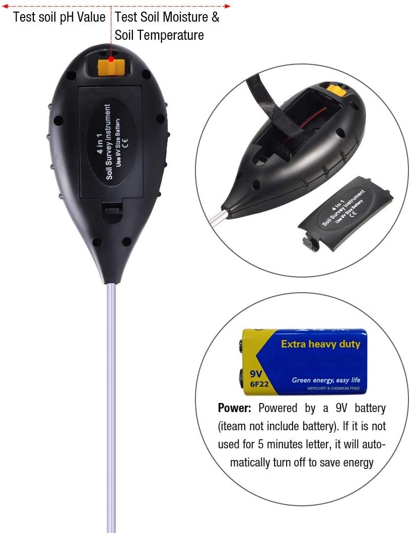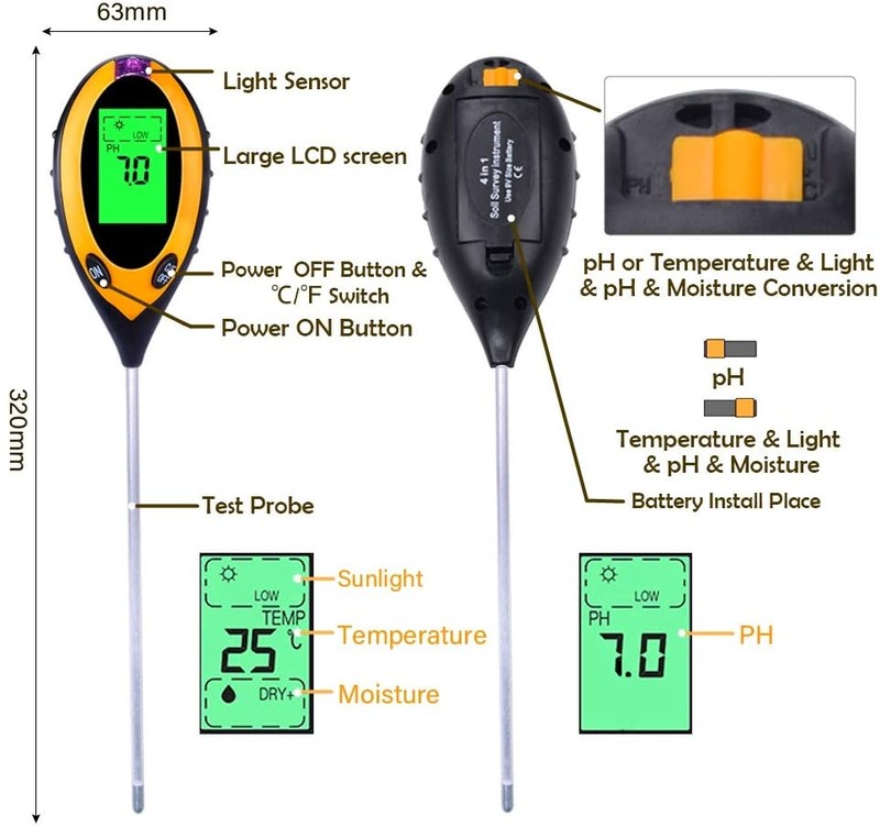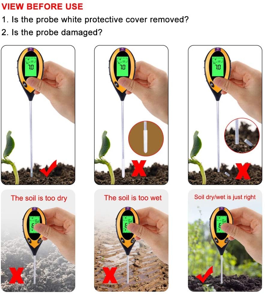✅다기능: 1.Let 당신이 때 물을 알게 하십시오. 당신은 결코 넘어서/이 검사자로 물 당신의 식물의 밑에 다시 할 것입니다. 2. 당신이 토양, 산성 알칼리성에 있는 Ph 수준을 통제하는 것을 돕습니다 당신의 식물을 위해 적당합니다. 3. 당신이 충분한 빛을 얻는 식물을 결정하는 것을 돕십시오.