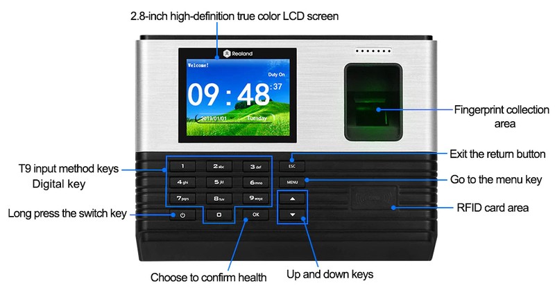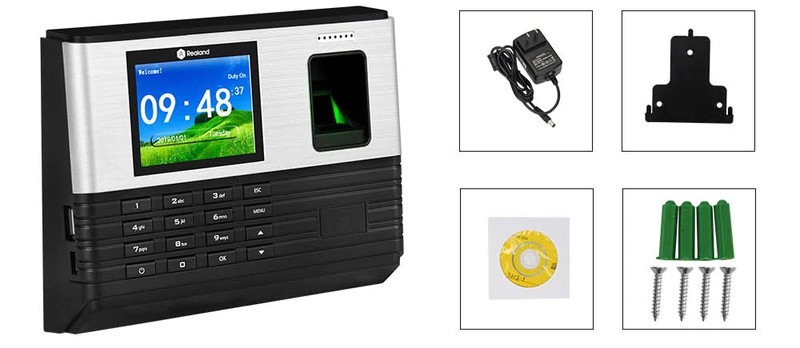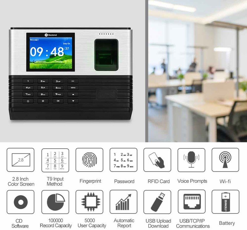 이 지문 타임 레코더를 사용하면 직원이 지문, RFID 카드 및 비밀번호로 체크인 할 수 있습니다. 5000 사용자 용량 지원, 5000 지문, 5000 암호, 5000pcs RFID 카드, 10관리자, 100000 레코드 용량