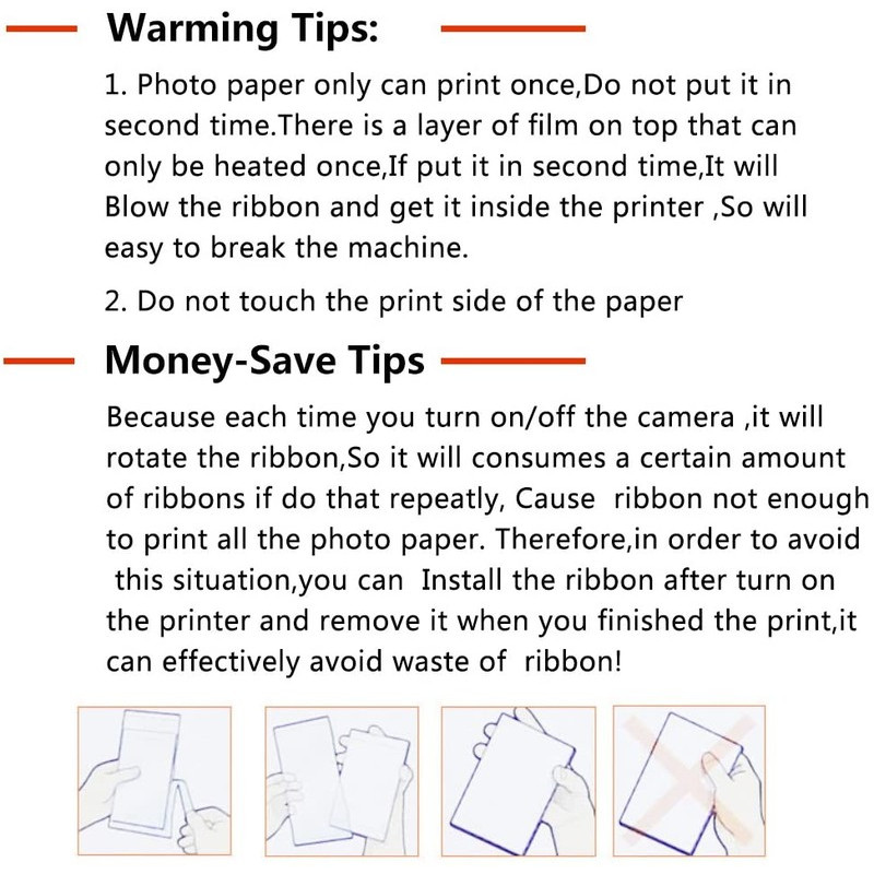 -Do not print for second times when the photo paper is printed.Only one layer of film can only be heated , or the ribbon will break for second times.