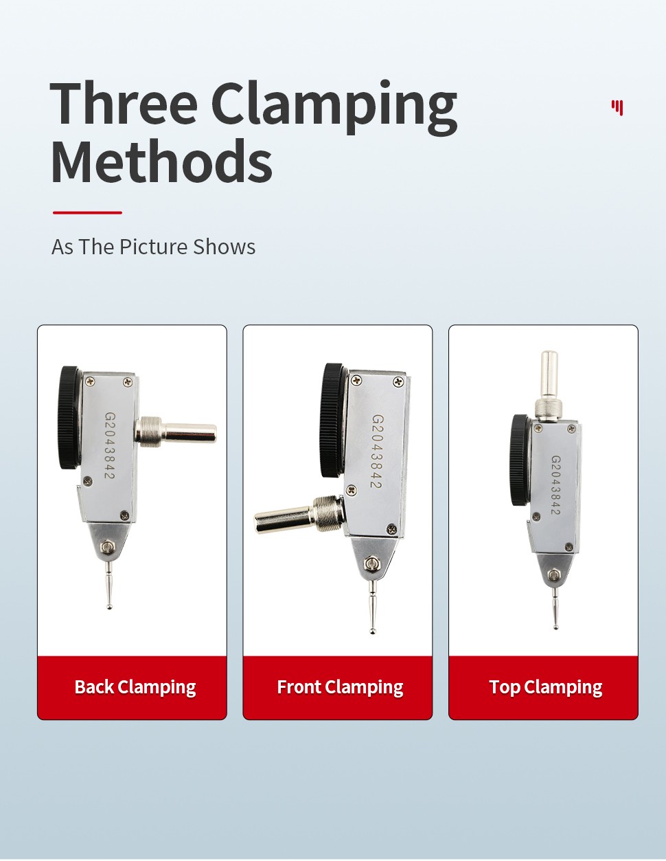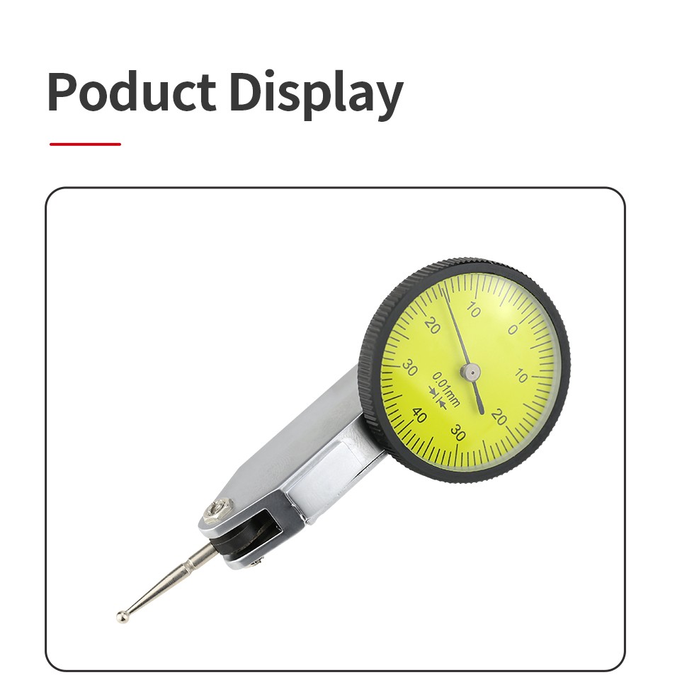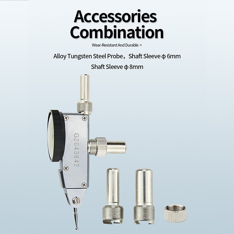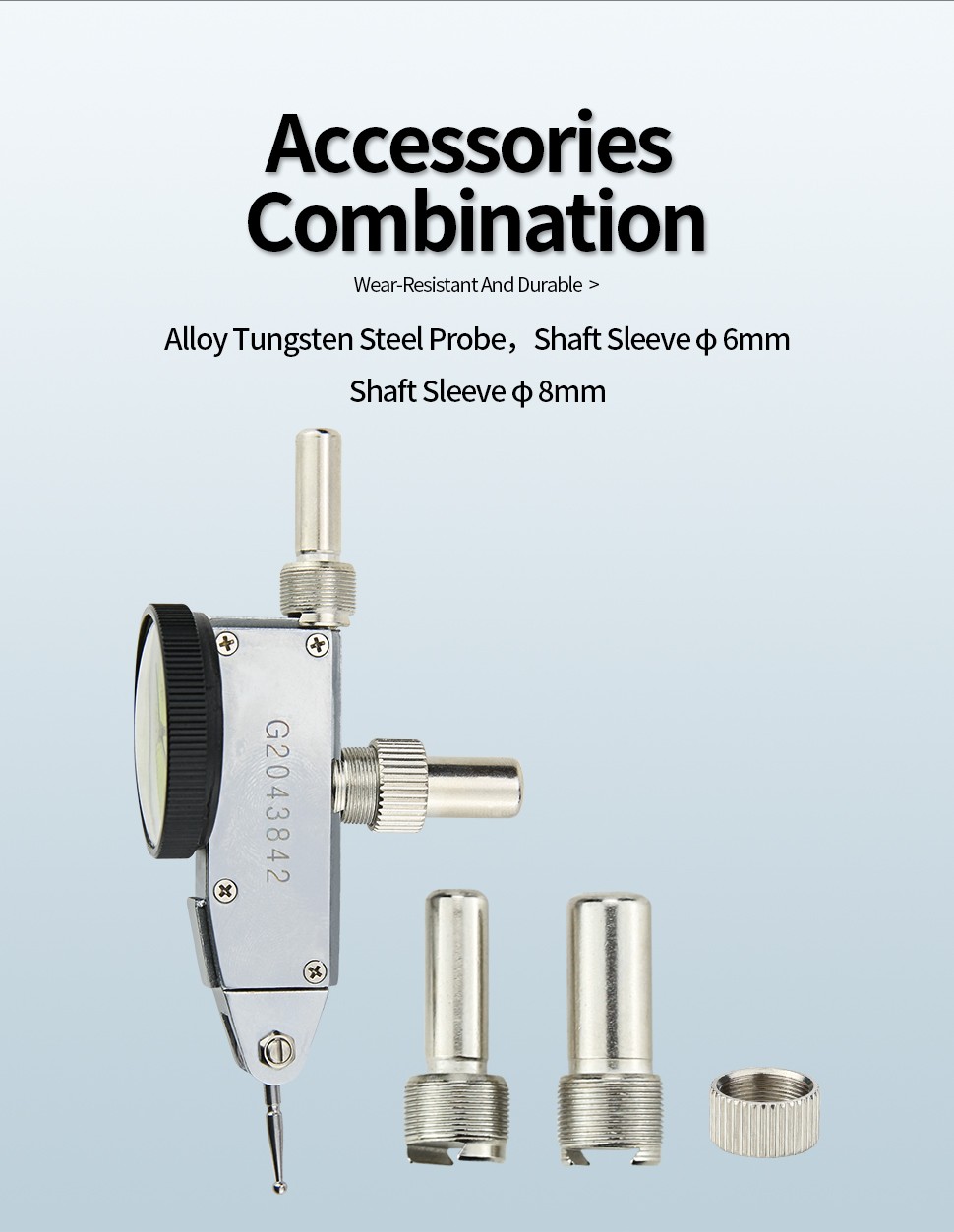 Features: The measuring probe of the lever dial indicator can be adjusted 240° at will. The measuring probe is made of alloy tungsten steel. Accessories combination: shaft sleeve φ6mm, φ8mm.