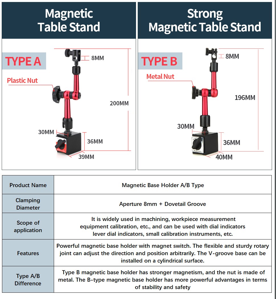 Type A/B difference: Type B magnetic base holder has stronger magnetism, and the nut is made of metal. The B-type magnetic base holder has more powerful advantages in terms of stability and safety.