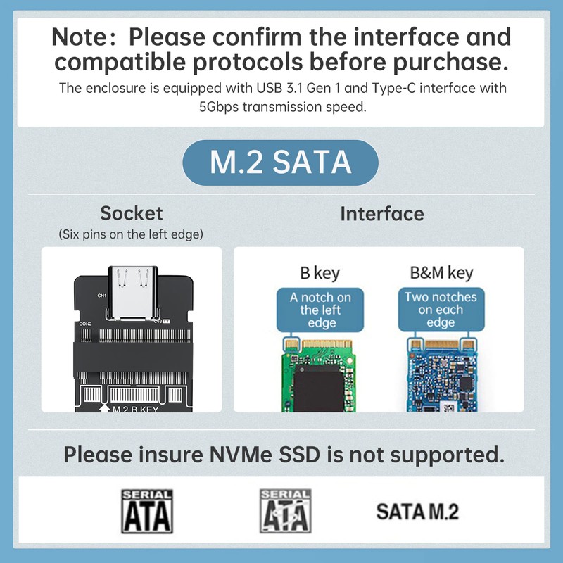 Only support NGFF SATA protocol B key/B&M Key SSD, with 15cm type-c to USB 3.0 cable.