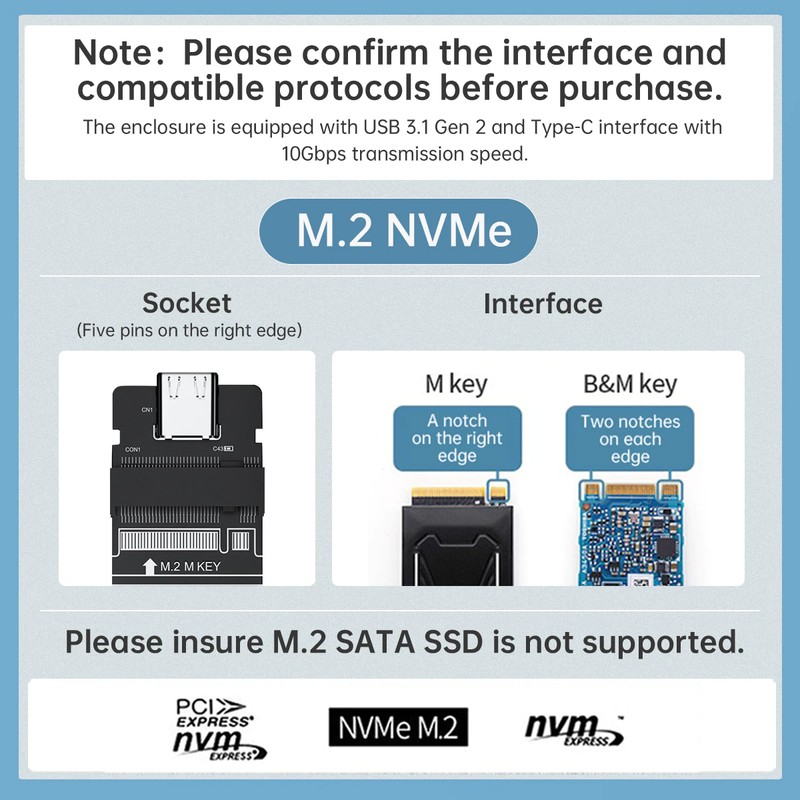 Only support NVME PCI-E protocol M key/B&M Key SSD, with 15cm type-c to type-c cable and 15cm type-c to usb3.0 cable.