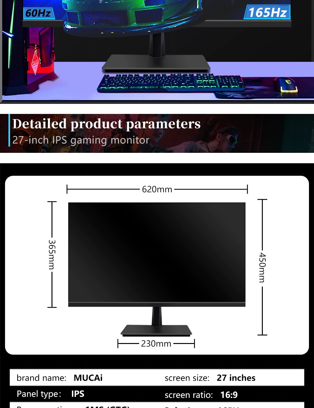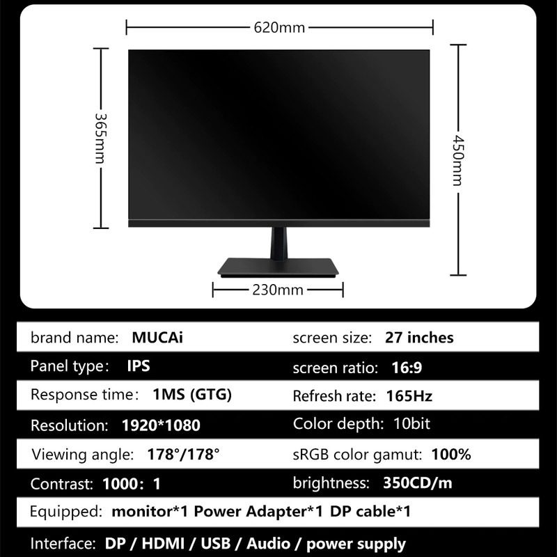 Mucai 27 Inch Pc Ips Monitor 144Hz Lcd Display Hd 165Hz Desktop Gaming Computer Screen Flat Panel Hdmi/Dp