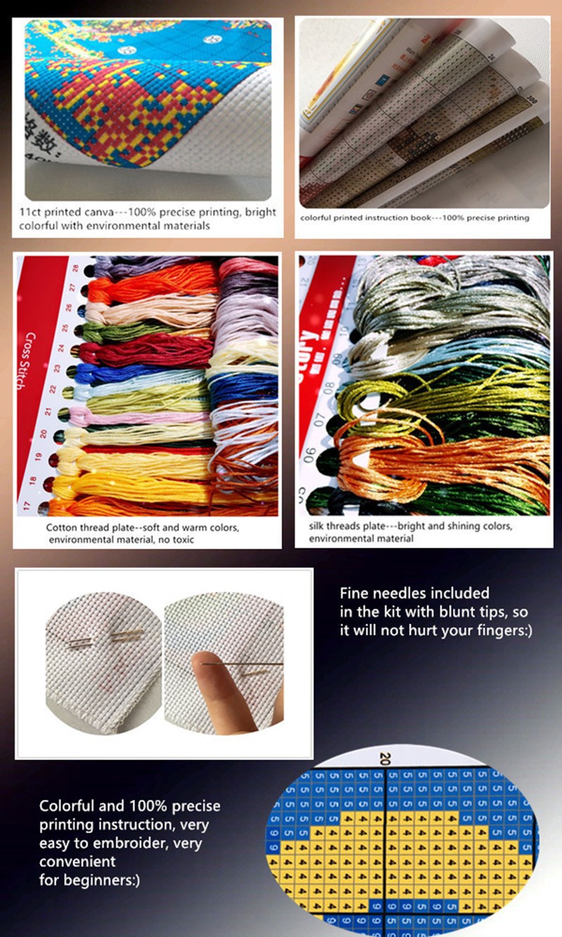 Printed cross-stitch, cross-stitch printed on the cloth, using the latest laser technology, the cross-stitch pattern is completely printed on the embroidered cloth with special ink, and the pattern is clear and easy to distinguish, and 100% accurate, unbiased Grid.