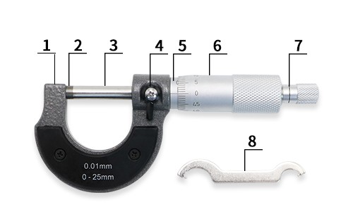 1.Frame 2. aambeeld 3.Spinde 4. vergrendeling 5. mouw 6. vingerhoed 7.Ratchet stop 8.Spanner