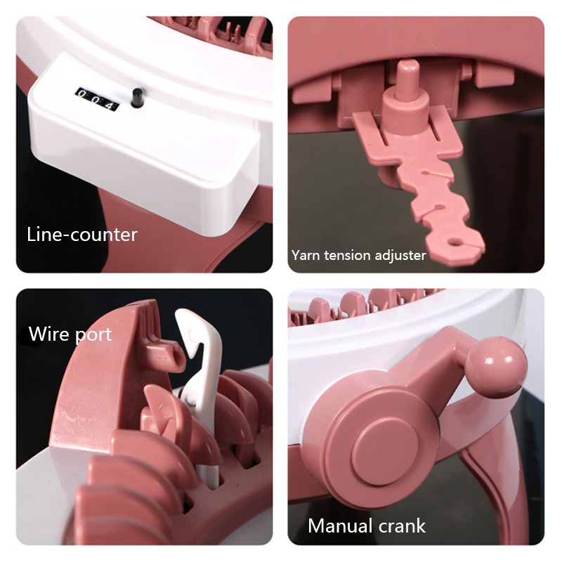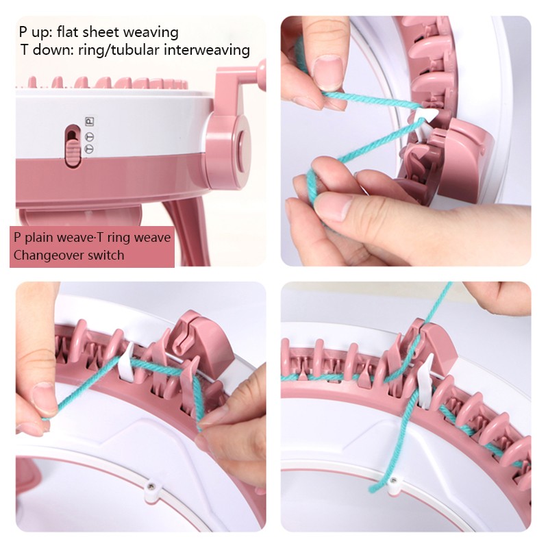 Deze handleiding breien machine heeft een dual mode aan een verscheidenheid van behoeften. T loop knit, na de eerste beurt om een tand lek, start een rechtsom rotatie om geweven een cilindrische stof, kan worden gebruikt als een hoed na afwerking. P platte knit, u kunt de breedte van de stof volgens uw behoeften, en gebruik de naald en gehaakte om vrij splicing in een sjaal, etc