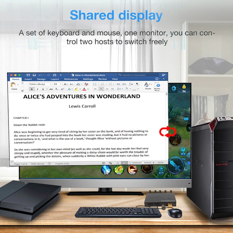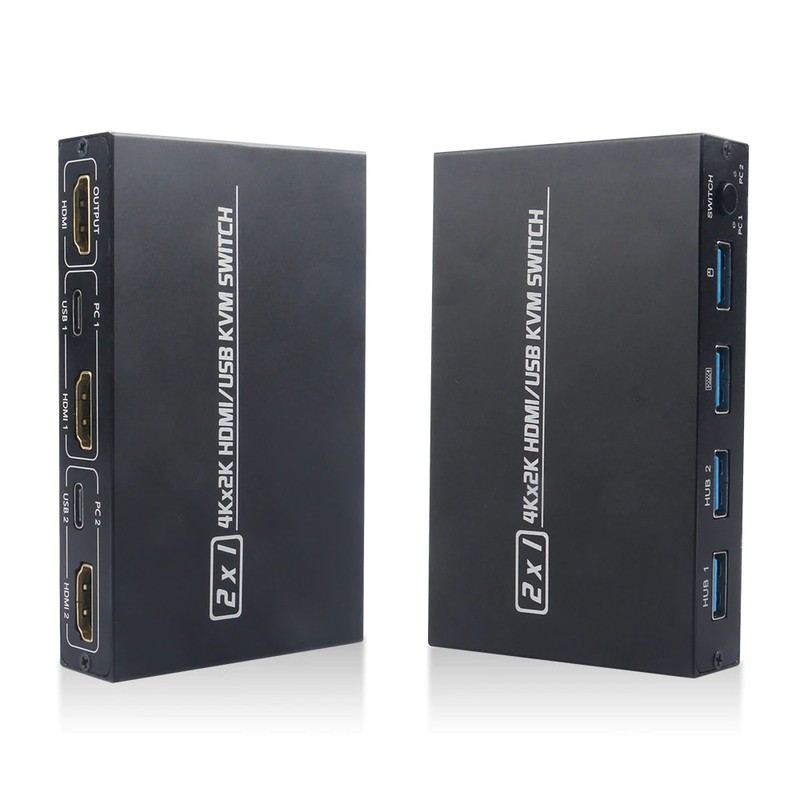 De KVM box is ontworpen met twee HDMI-compatibel input poorten en een uitgang poorten, die effectief kan verbinden twee computer gastheer met een monitor. De twee computer host kan ook gebruik hetzelfde toetsenbord en muis set, maken uw bureau netjes en bezetten minder installatie ruimte.