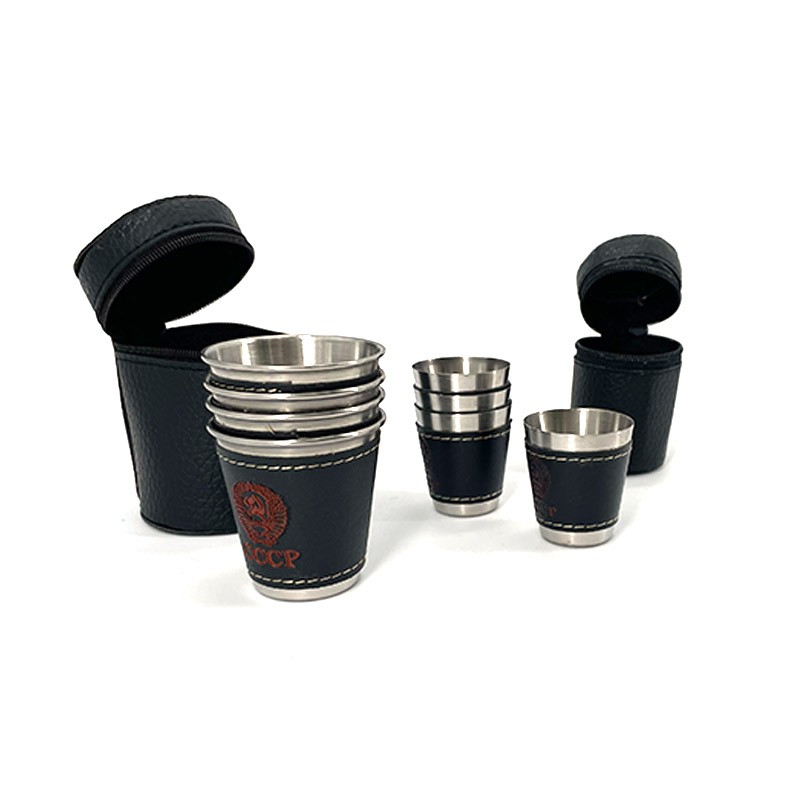 4 Stks/Partij 30/70Ml Outdoor Camping Servies Travel Cups Set Picknick Benodigdheden Rvs Wijn Bier Cup Whisky Mokken Pu Leer