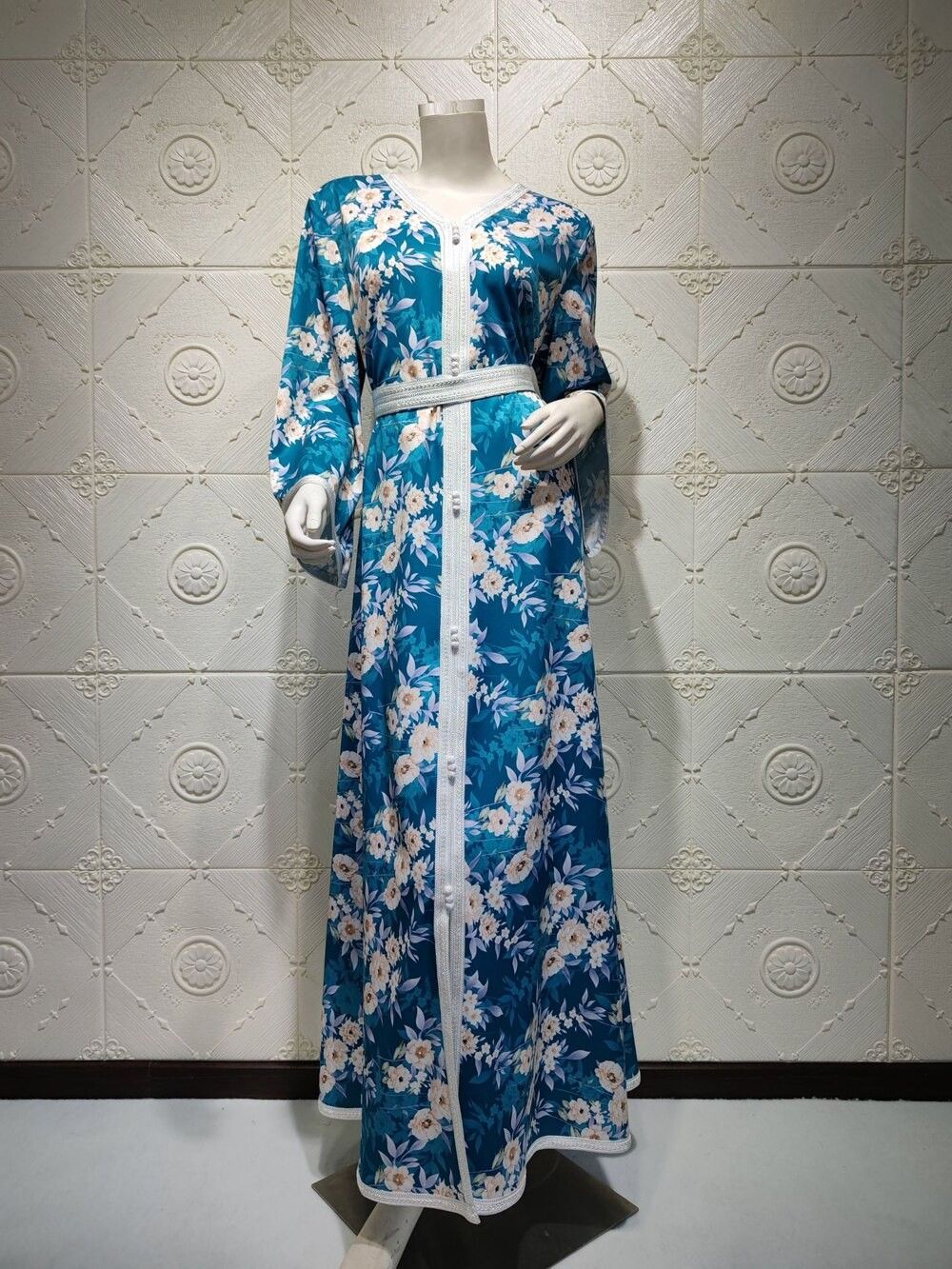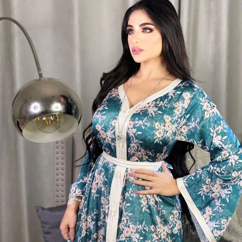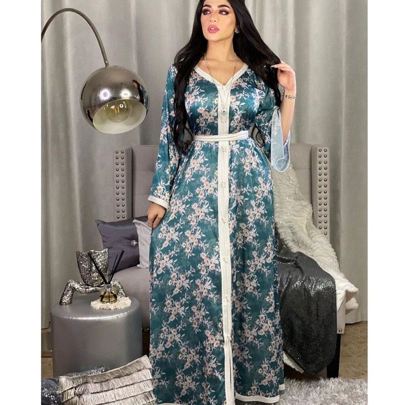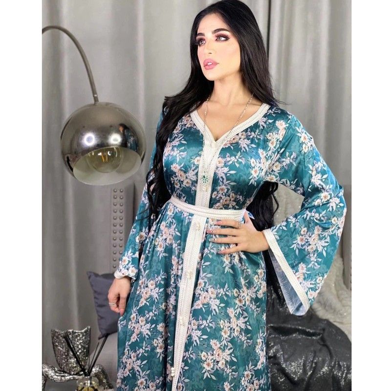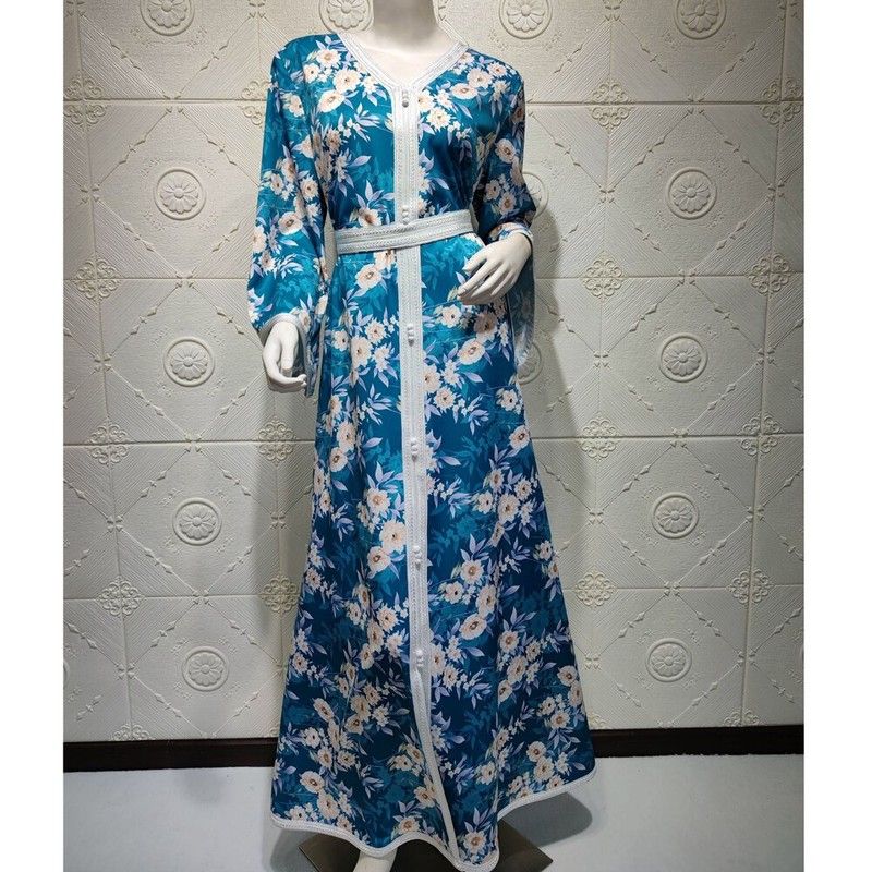 Ab030 Luxe Jurk Hemelsblauw Blue Abaya Soiree Moslim Vrouw Dubai Islamitische Kleding World Kleding Winkel Turkse Mooie Print Flora