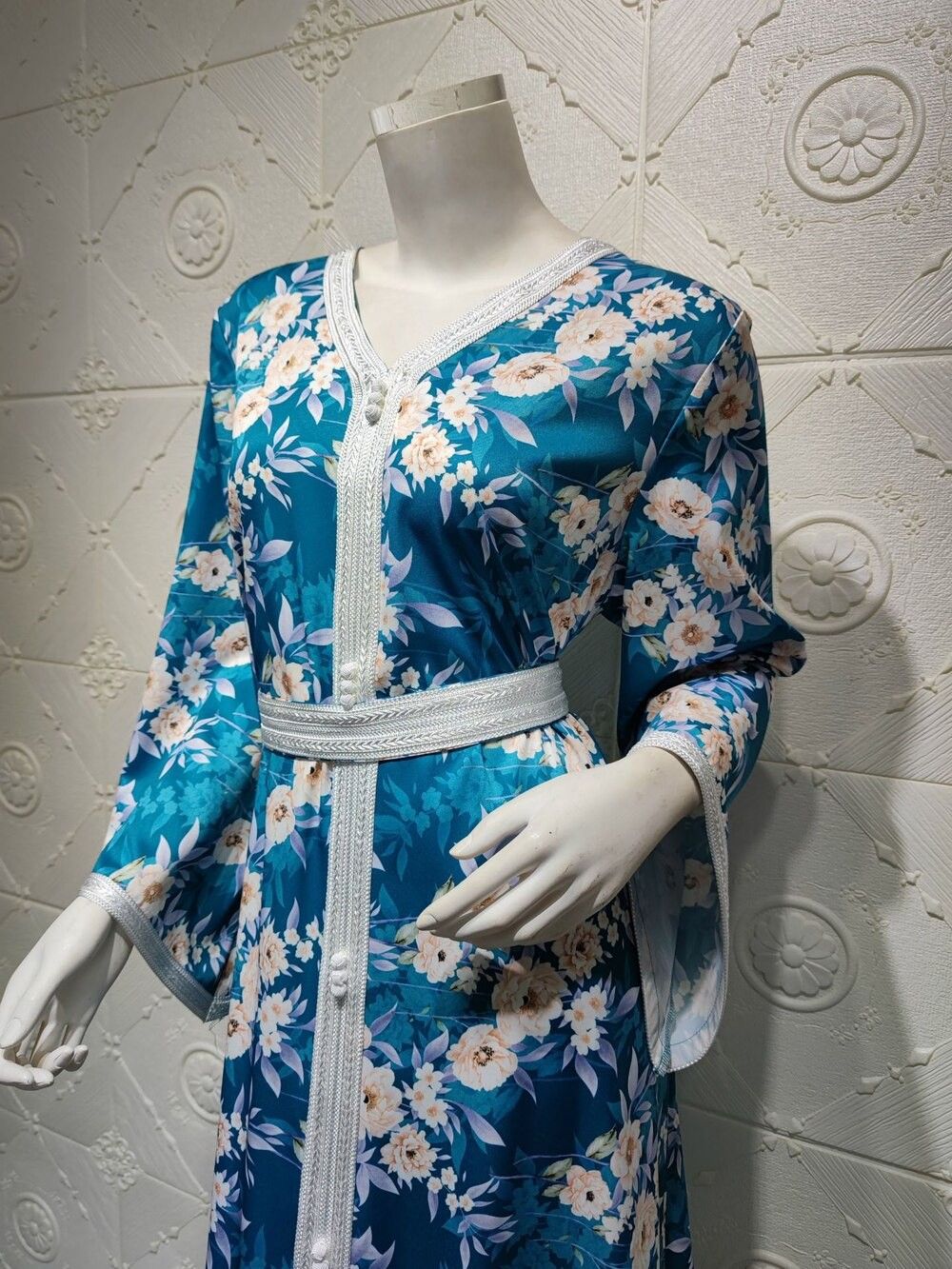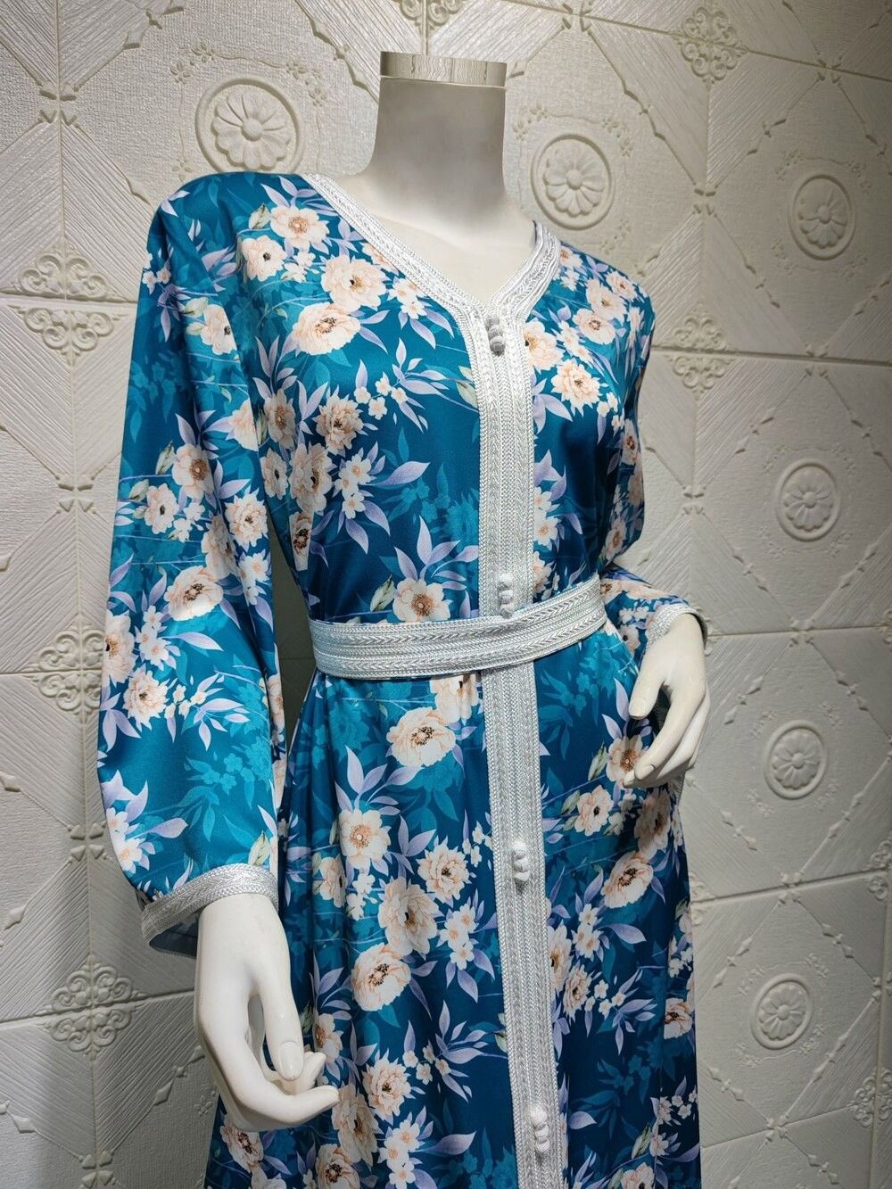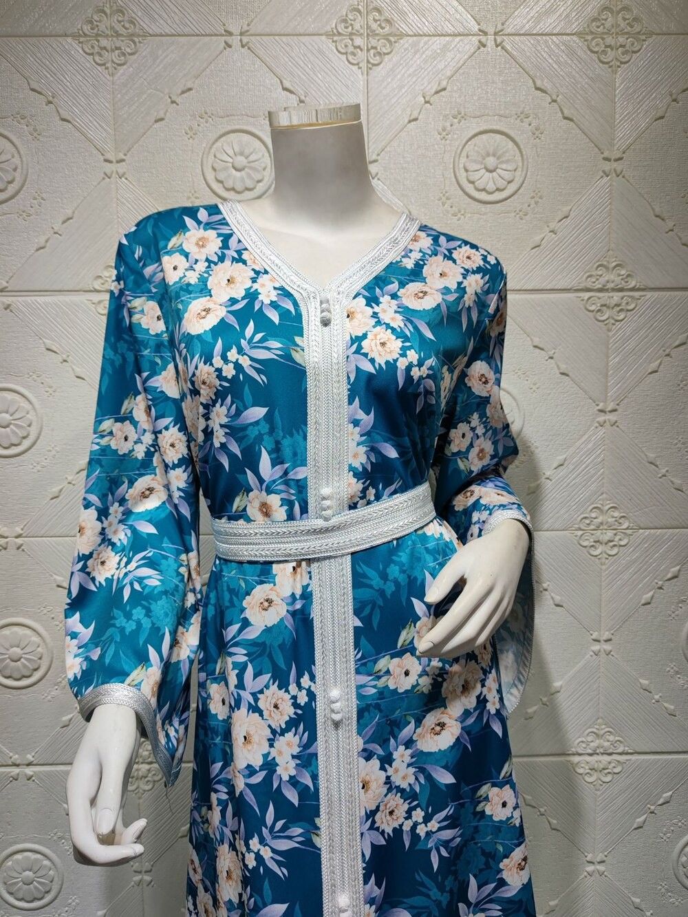Ab030 Luxe Jurk Hemelsblauw Blue Abaya Soiree Moslim Vrouw Dubai Islamitische Kleding World Kleding Winkel Turkse Mooie Print Flora