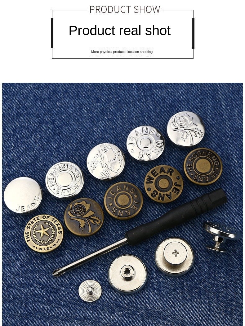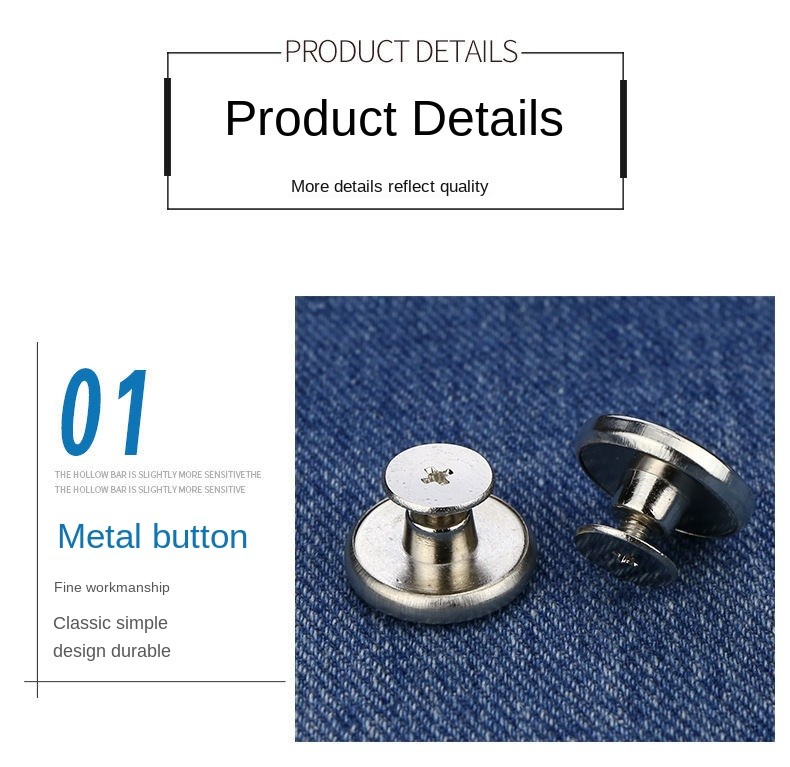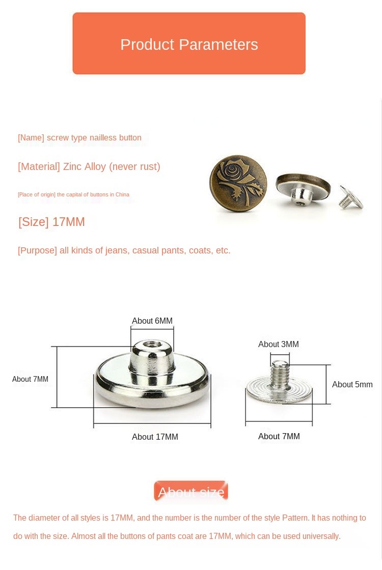 Verwijderbare knoppen zijn gemaakt van hoge-kwaliteit metalen, niet roestig, sterk en duurzaam en niet gemakkelijk te krijgen erosie. versterkte klinknagels, decoratieve patroon op oppervlak en de metalen basis is dikker, zijn niet gemakkelijk te buigen en schade onder vinger druk.