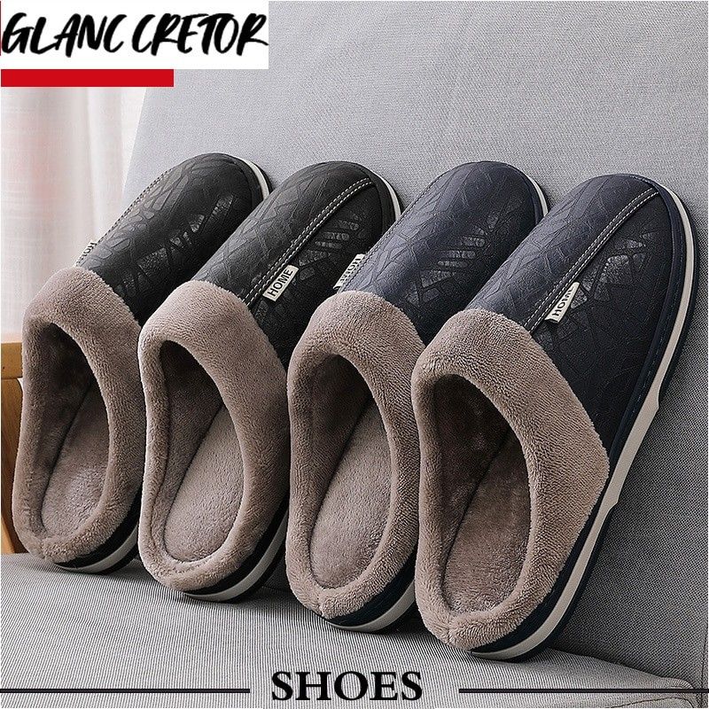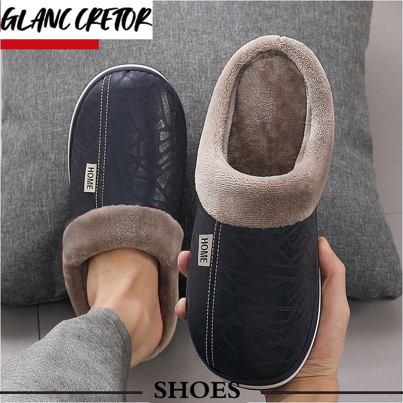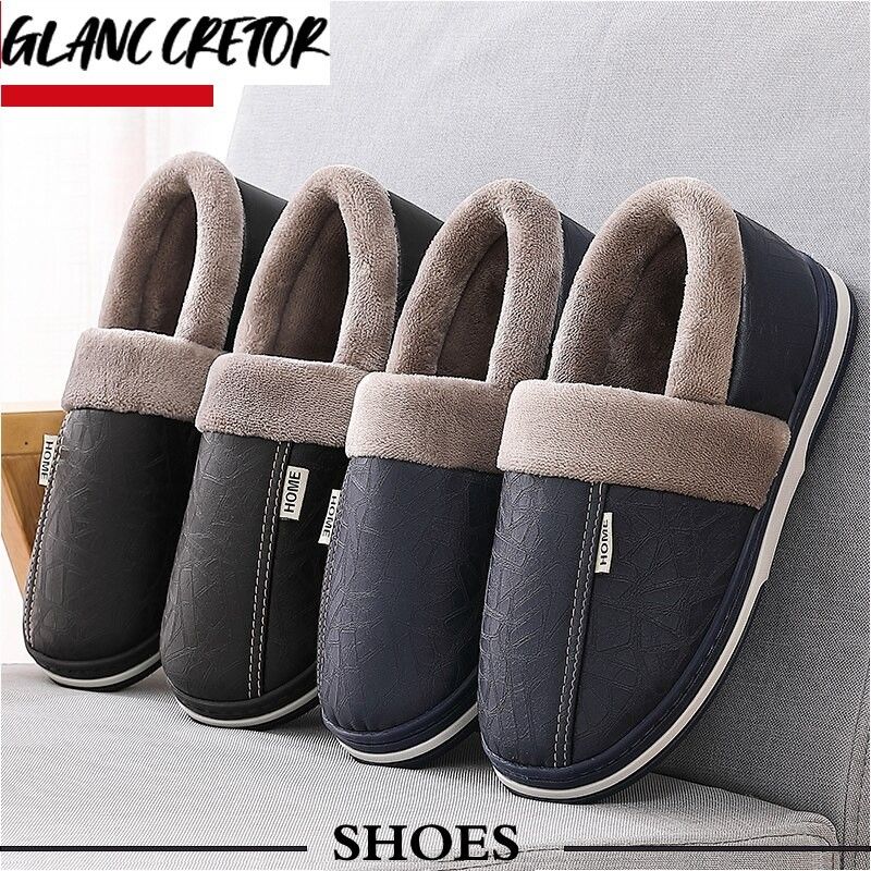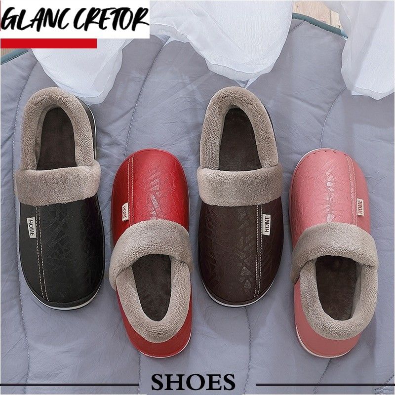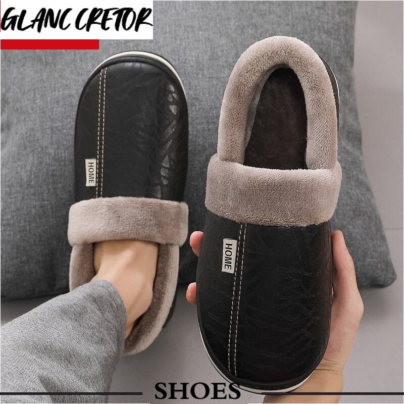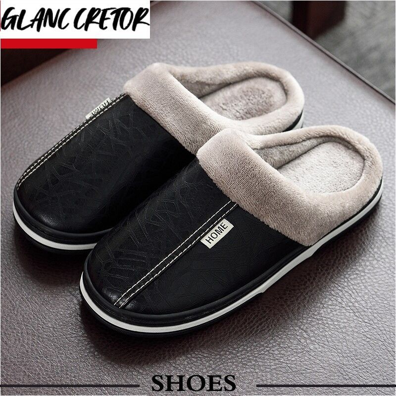 Big Size Voor Mannen Pu Lederen Slippers Indoor Waterdichte Thuis Bont Mannelijke Paar Platte Vrouwen Mannen Winter Slipper Katoen Schoenen