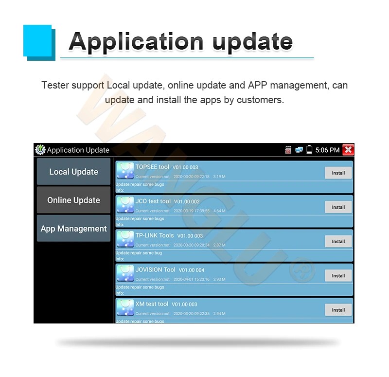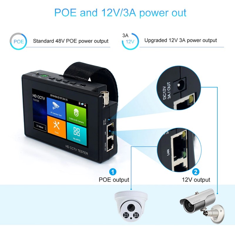 De 5 inch IPS touchscreen IP camera tester is ontworpen voor onderhoud en installatie van IP analoge, HD coaxiale camera's als andere beveiliging apparatuur. De 1920*1080 resolutie maakt het display netwerk HD camera en analoge camera's in hoge resolutie. Het apparaat ondersteunt vele ONVIF PTZ en analoge PTZ control, en kabel test functies. CCTV installateurs vaak nodig om een verscheidenheid van testtools te voltooien hun werk. Als het alle in een camera tester, maken arbeidsomstandigheden veiliger en toenemende productiviteit.