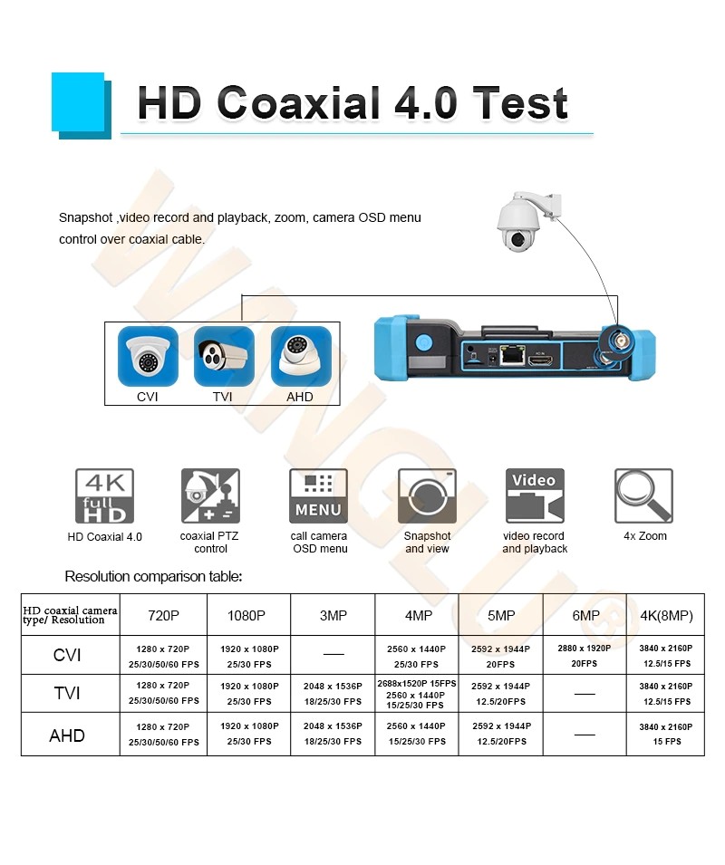 Auto HD app, auto herkennen HD coax camera type en resolutie, ondersteuning snapshot, video opnemen en afspelen, coaxiale PTZ & call osd-menu.