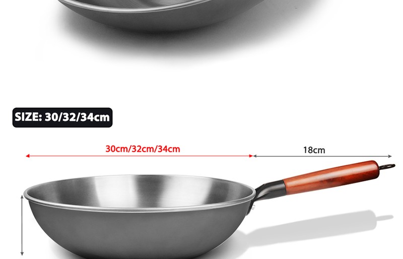 ●【Size】The grootte van deze wok is 30cm, 32cm, en 34cm. Diameter van de bodem van de pot-Na een uitgebreide test, het kan worden gebruikt op elektrische kachels, inductie fornuizen, gas kachels en andere warmtebronnen.
