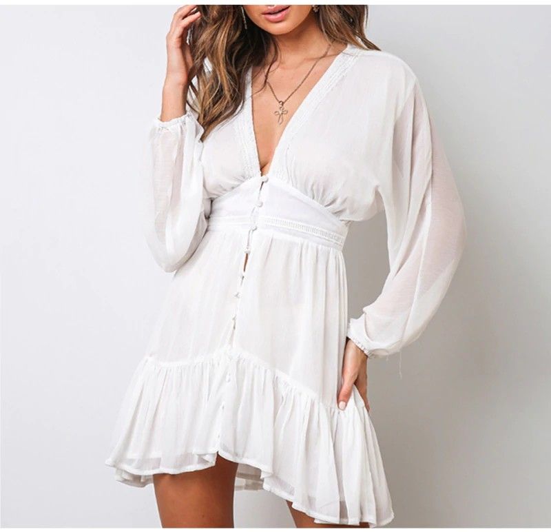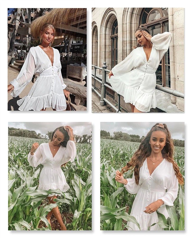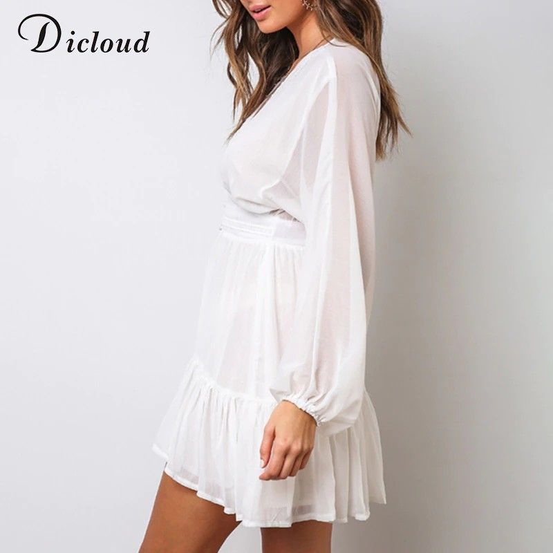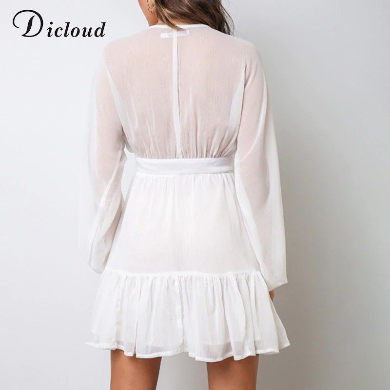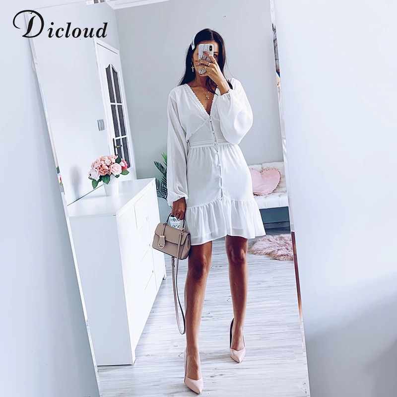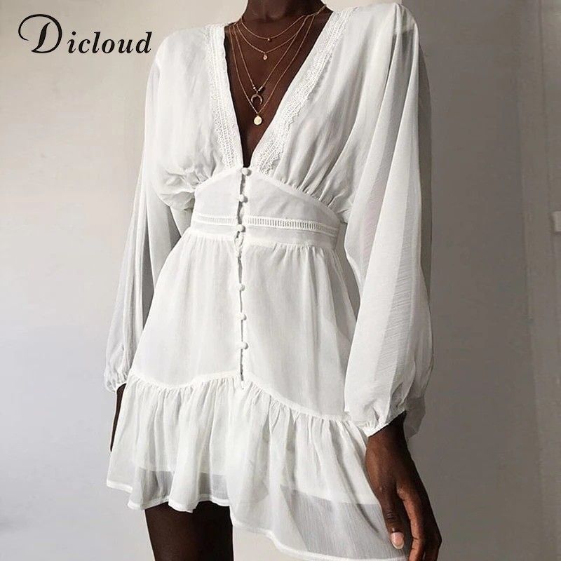 Dicloud Sexy duik V-Hals Vrouwen Zomer Jurk Wit Kant Lange Mouwen Mini Wedding Party Jurk Bijenkorf Elegante Kleding Nieuwste