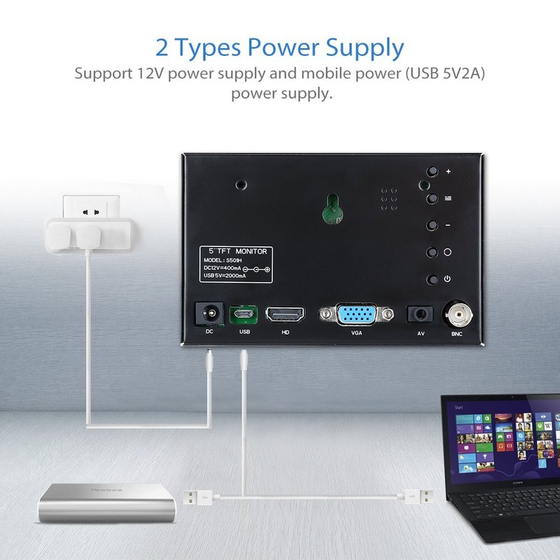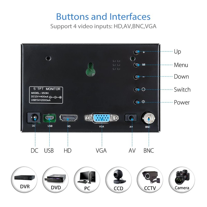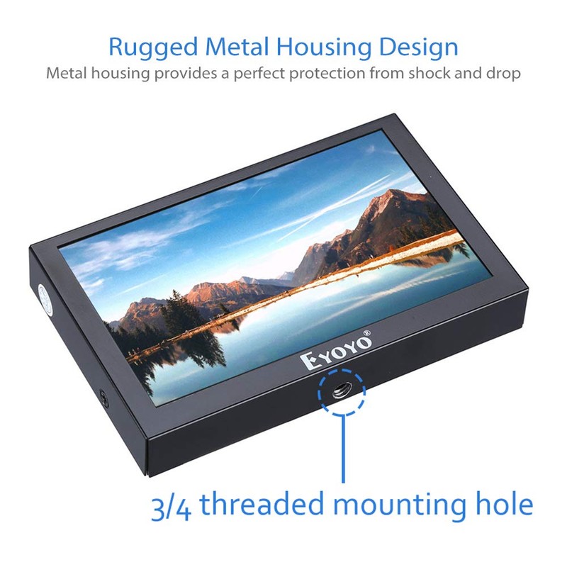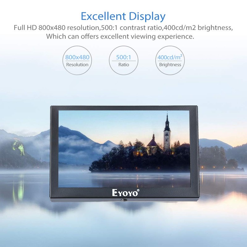 De Eyoyo mini HDMI multi-poort monitor, bieden Professionele fabriek kleur gekalibreerd Native resolutie HD 800*480 hoge resolutie Precieze Kleur. Het ondersteunt VGA, HDMI, BNC en AV ingangen zodat u gemakkelijk kunt verlengen de genot van vele apparaten op Full HD display. Wat meer, deze monitor ondersteunt USB charge en 12V DC voeding lading.