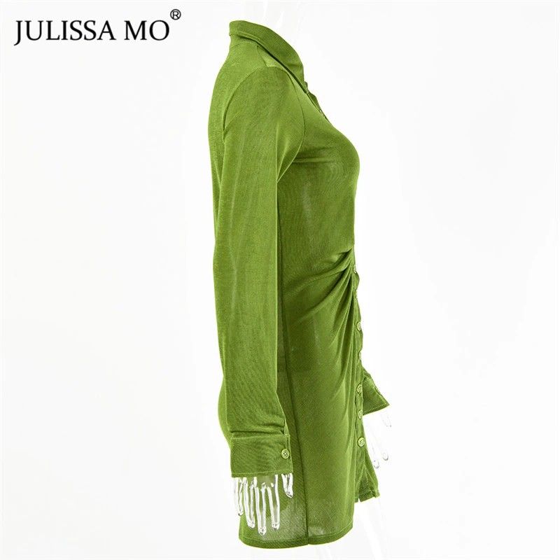 Julissa Mo Herfst Ruches Lange Mouwen Bodycon Vrouwen Jurk Turn-Down Kraag Sexy Mini Jurk Vrouwelijke Knop Slim Party Vestidos Laatste