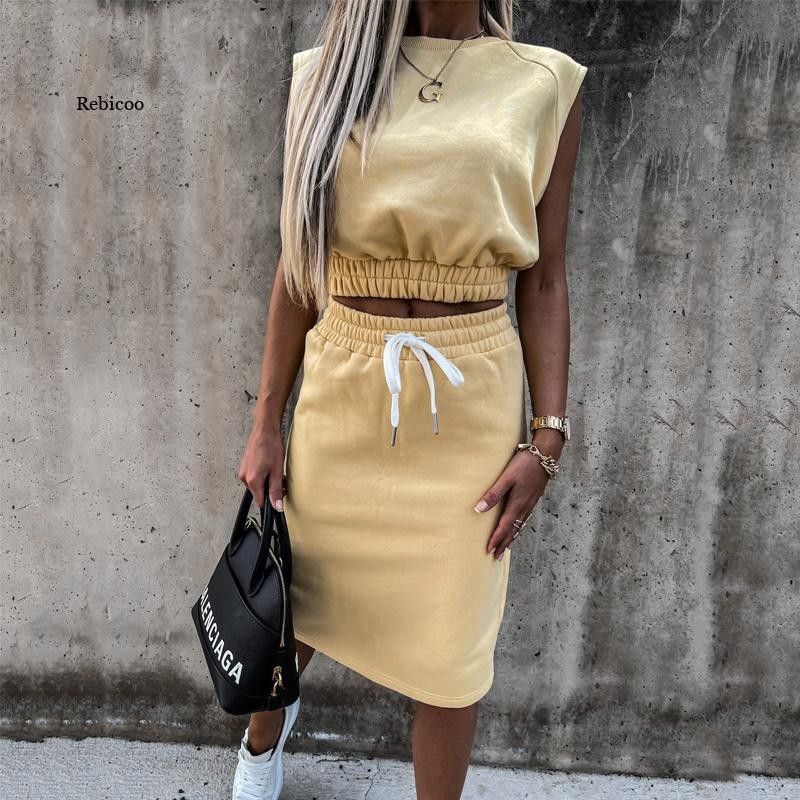 Lady Office Elegante Rok Verleden Zomer Mode Mouwloze Tops En Casual Trekkoord Rokken Outfits Vrouwen Solid Tweedelige Sets