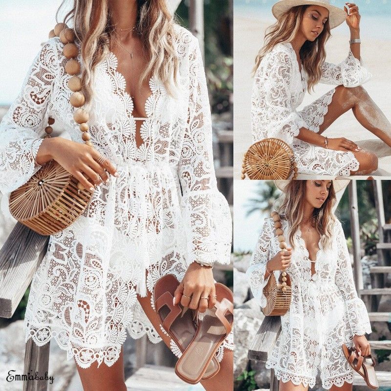 Laatste Nieuwe Zomer Vrouwen Bikini Cover Up Bloemen Kant Hollow Haak Badpak Cover-Ups Badpak Strandkleding Tuniek Strand Jurk Hot