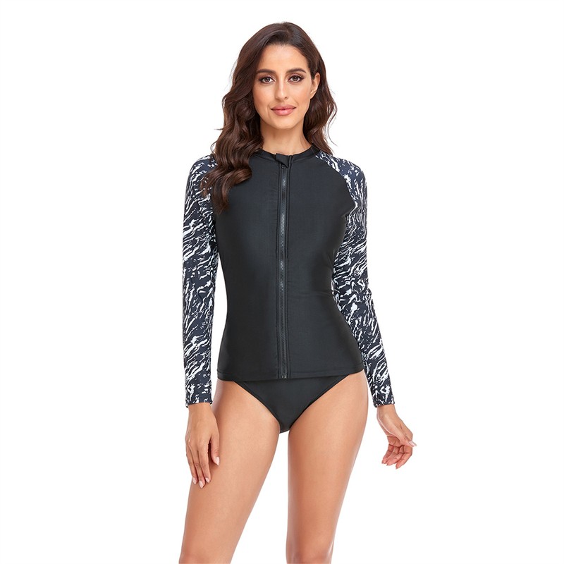 | Lange Mouwen Rash Guard Vrouwen Print Badmode Rits Twee Stuk Surf Pak Patchwork Badpak Hoge Hals Duiken Pak 2XL Badpak |