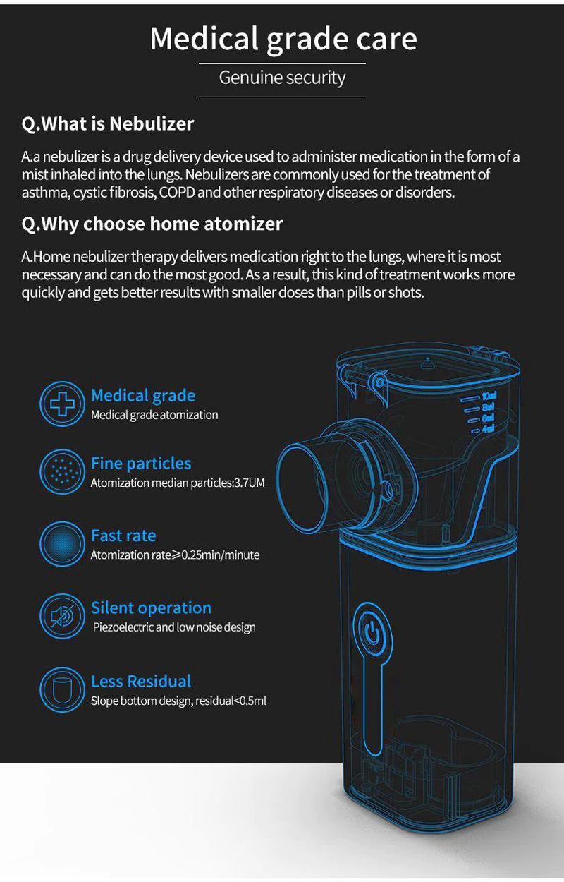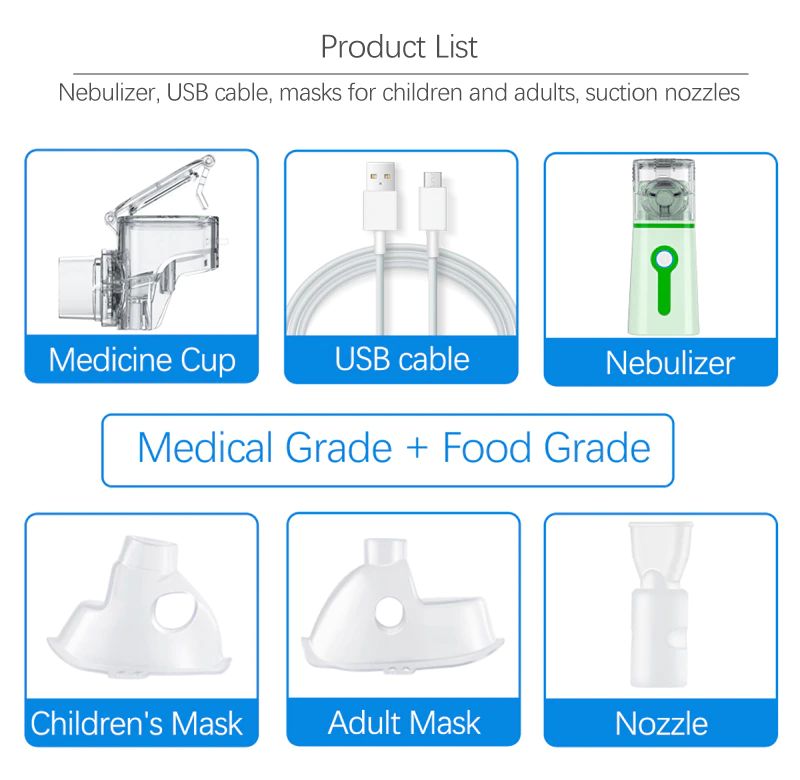 De medische vernevelaar is gemaakt van medische kwaliteit materialen, met fijnere vernevelde deeltjes, en heeft doorgegeven medische certificering. Veiligheid is gegarandeerd