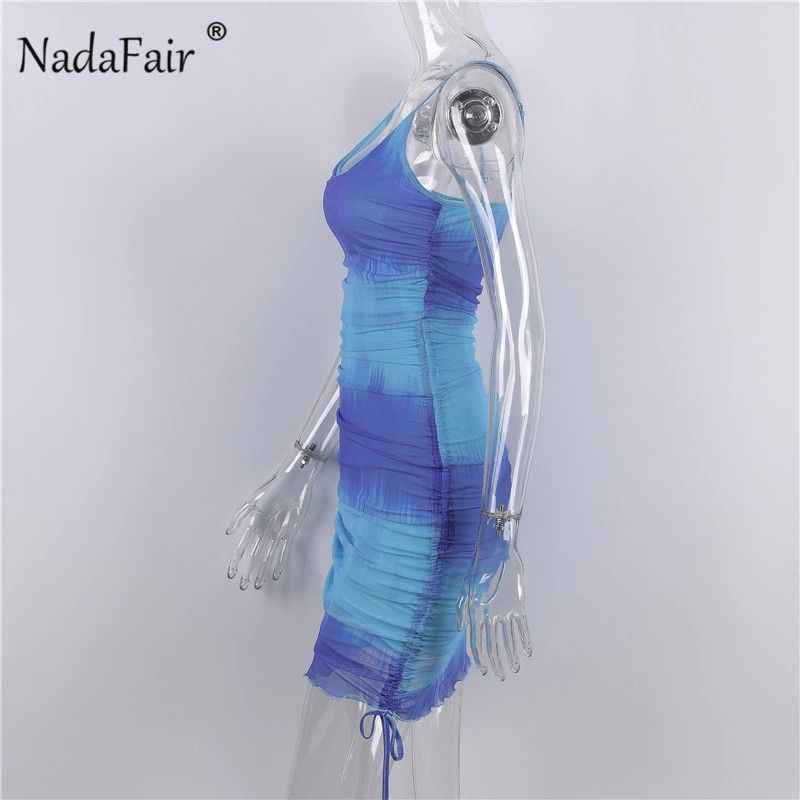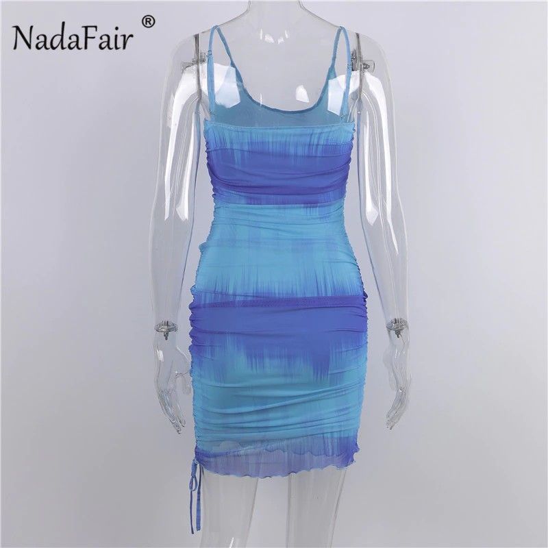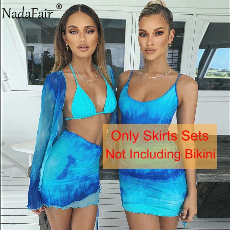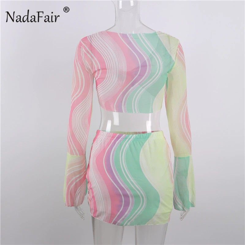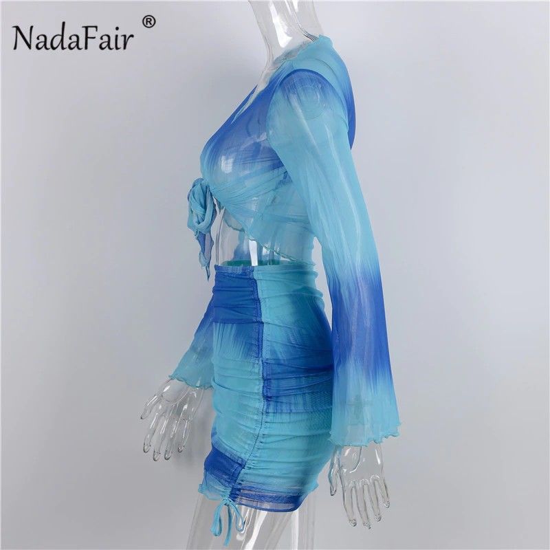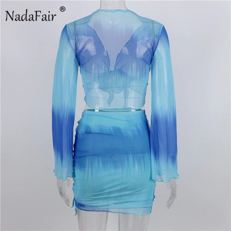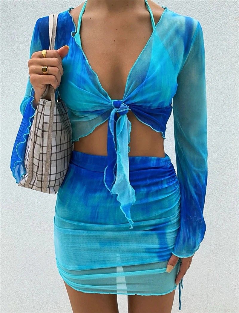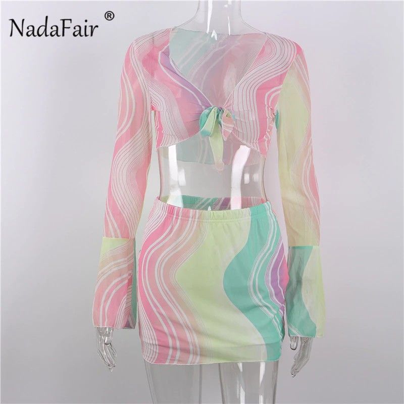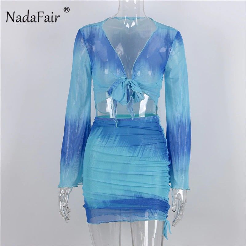 Nadafair Tie Dye Strand Sexy Jurk Vrouwen Tweedelige Set Club Outfits Lange Mouwen Crop Tops En Mini Rokken Bodycon Zomer Jurk