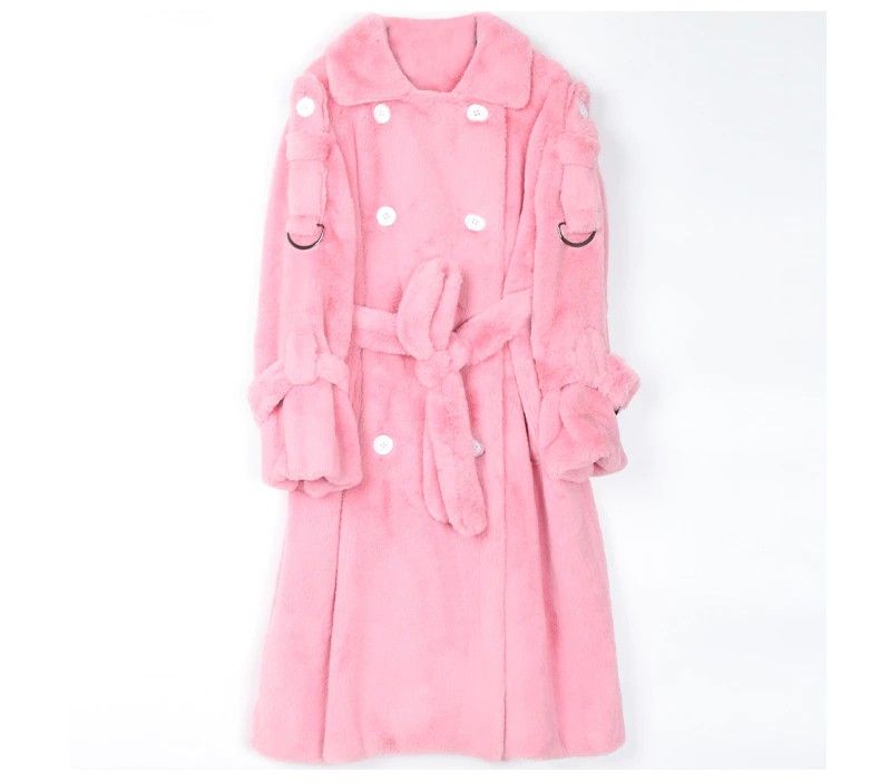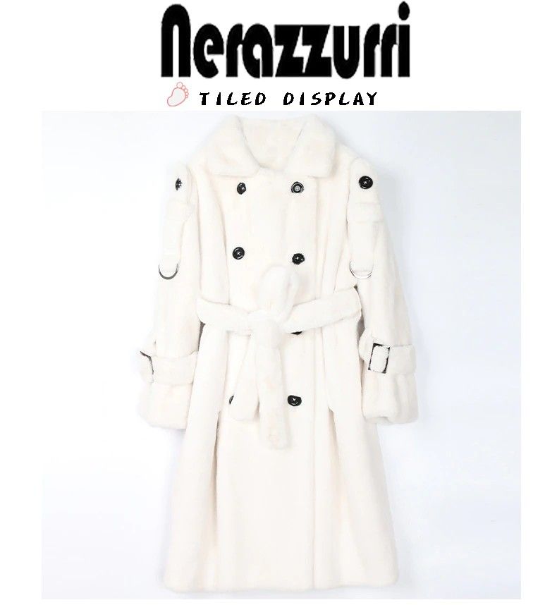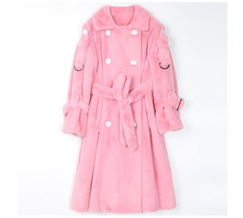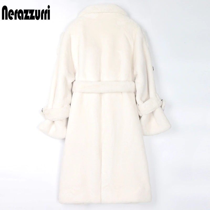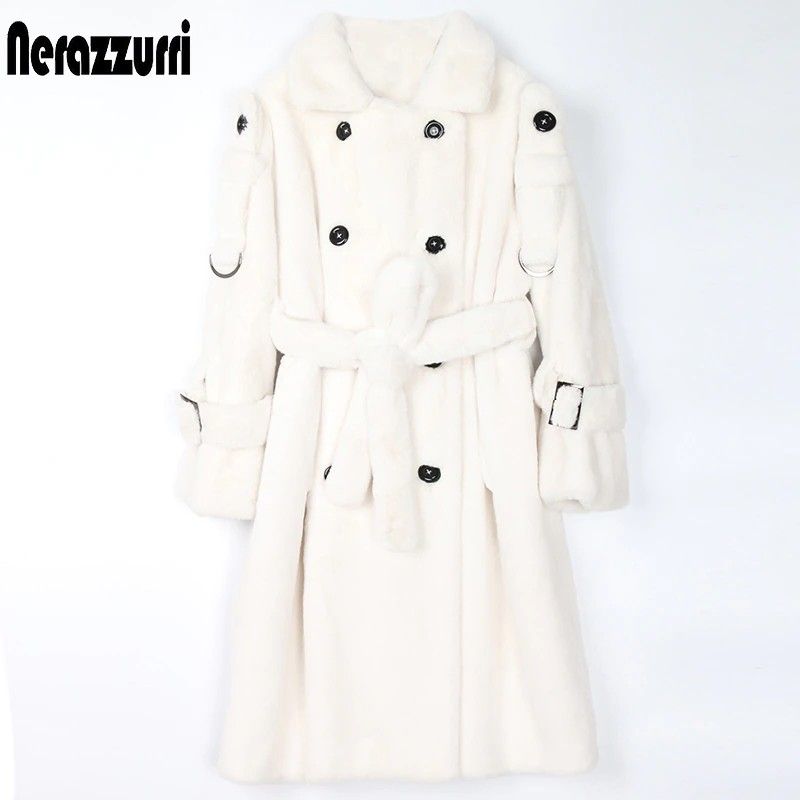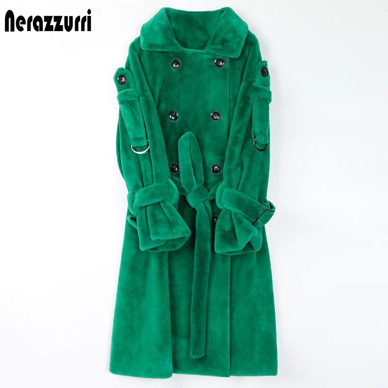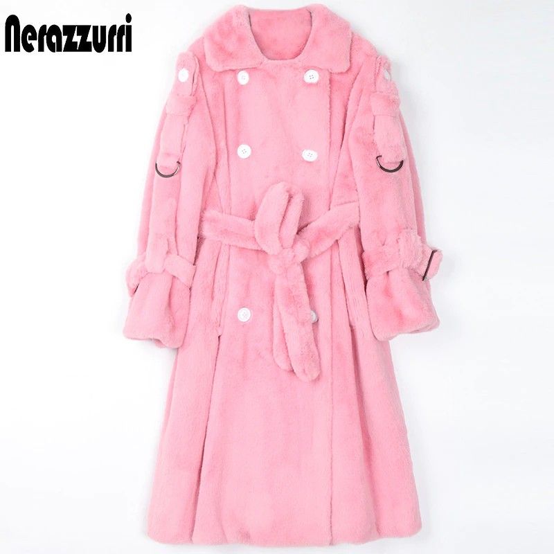 Nerazzurri Lange Warme Pluizige Faux Fur Trenchcoat Voor Vrouwen Laatste Double Breasted Roze Wit Groen Plus Size Winter Mode Riem