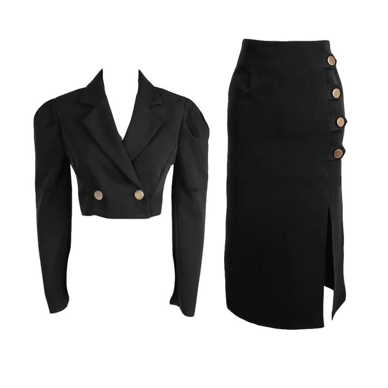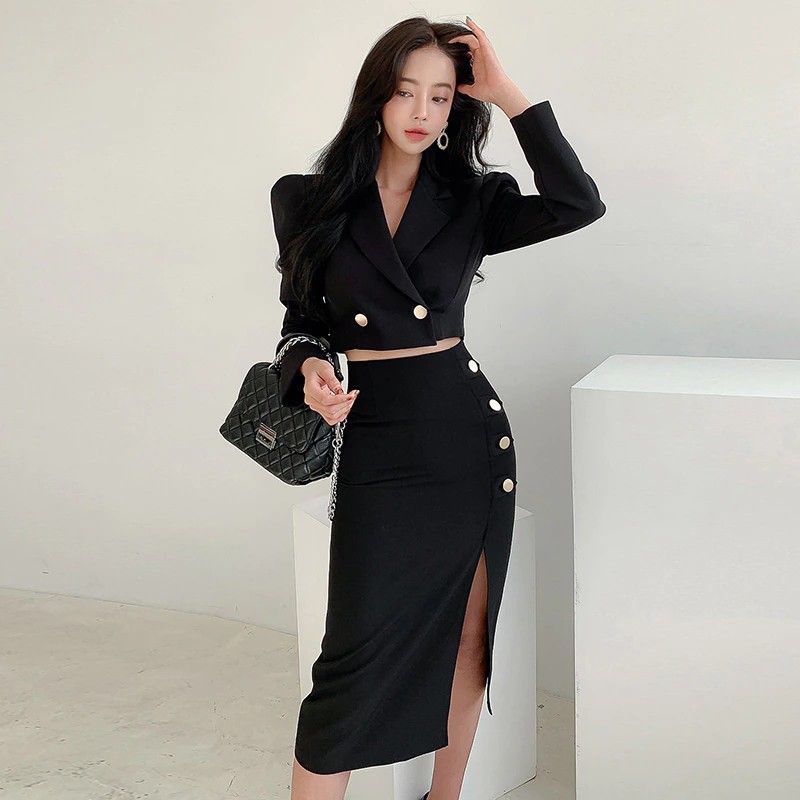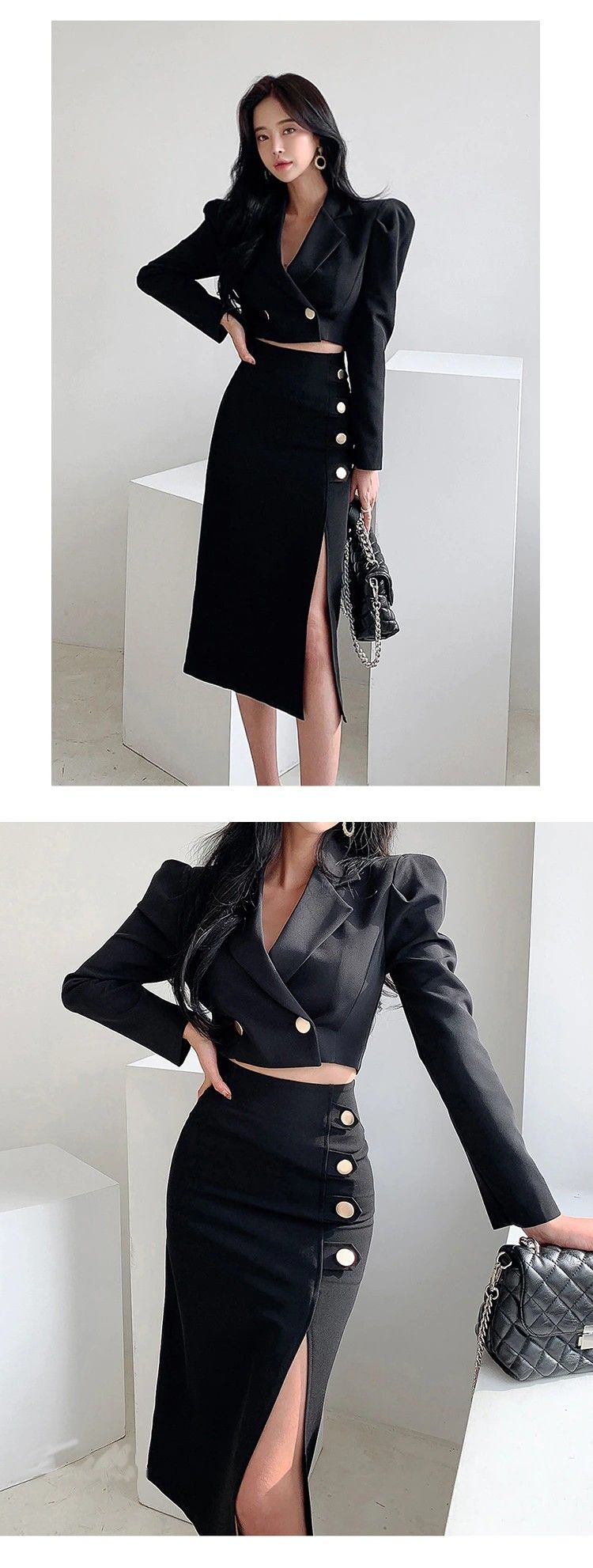 Nieuwe Collectie Mode Lente Zwart Set Vrouwen Ol Professionele Temperament Korte Pak En Split Midi Kokerrok Effen Rok Verleden
