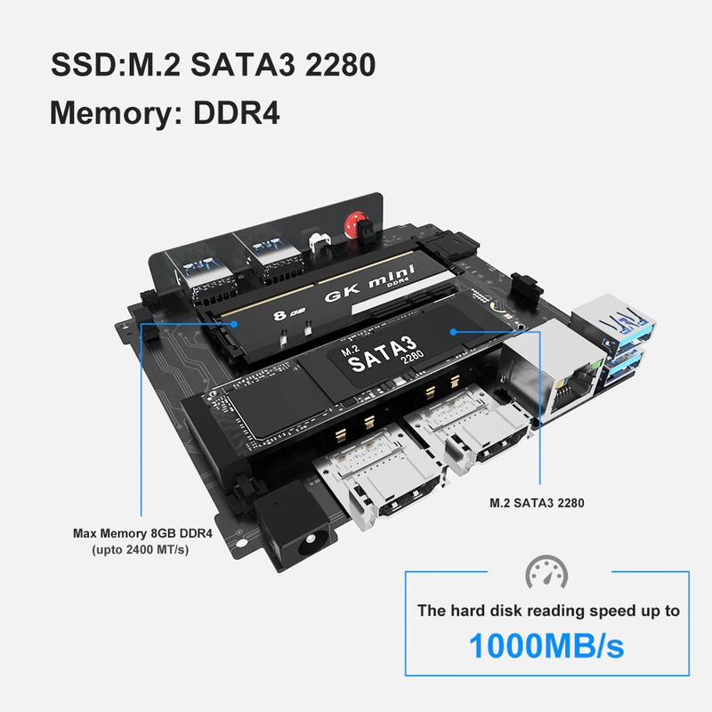 Gebruik DDR4 2400Mhz RAM, die kan ondersteunen tot 8GB single-channel. SSD card slot is M.2 poort, ondersteunt SATA3 Transfer Protocol, transfer snelheid kan bereiken 1000 MB/S, brengen een vloeiend ervaring.