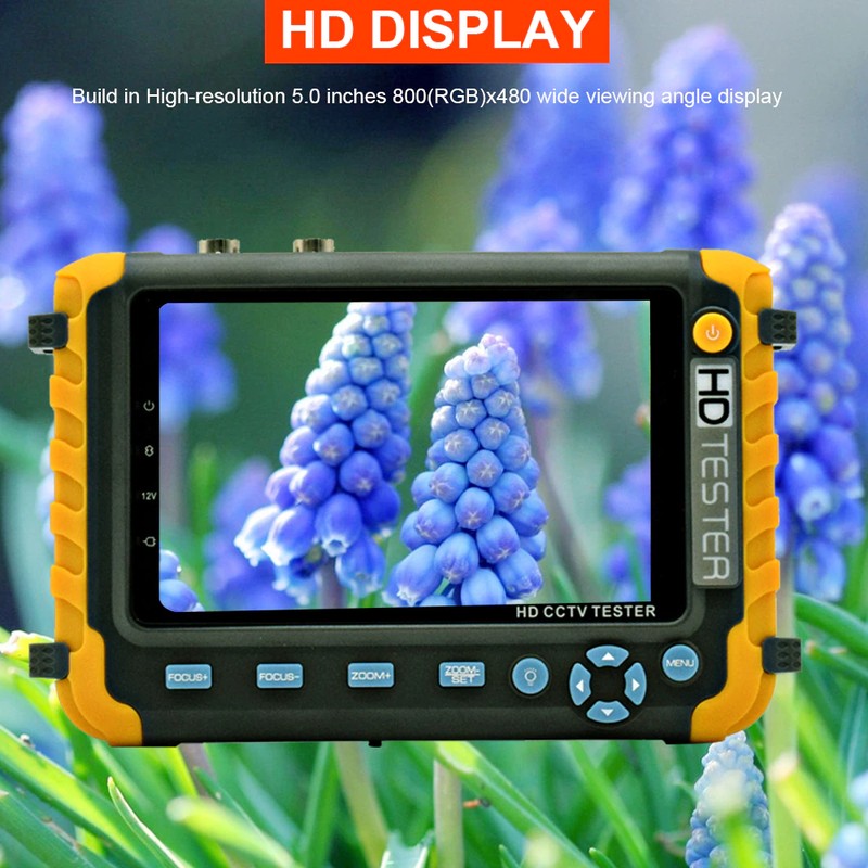 8W,--------------------------- Ondersteuning CVBS + AHD + TVI + CVI Camera Test, 4-In-1 CCTV Tester Monitor.5.0 inches 800x480 Hoge resolutie kijkhoek display, meer intuïtieve en gemakkelijk om de camera beeldkwaliteit, ondersteuning PAL/NTSC standaard video signaal.