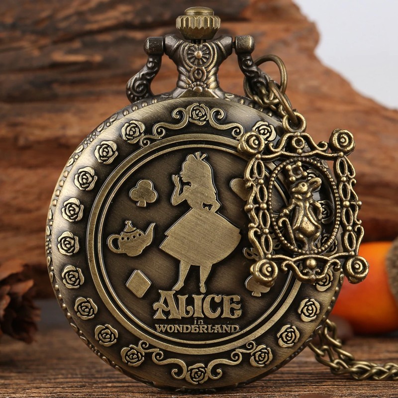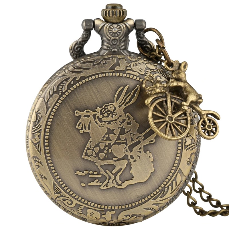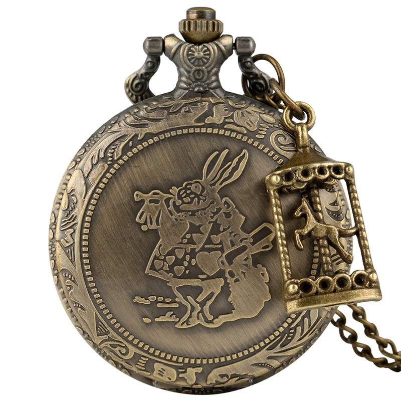 Retro Brons Dream Alice In Wonderland Konijn Poker Carrousel Accessoire Quartz Zakhorloge Collier Hanger Voor Meisje Vrouwen