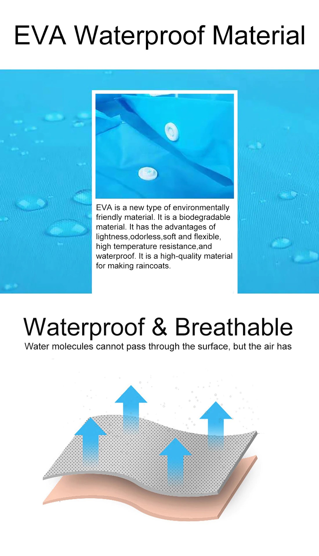 EVA is een nieuw type van milieuvriendelijke materiaal. Het is een biologisch afbreekbaar materiaal. Het heeft de voordelen van lichtheid, geurloos, zacht en flexibel, hoge temperatuur weerstand, en waterdicht. Het is een hoge-kwaliteit materiaal voor maken regenjassen.