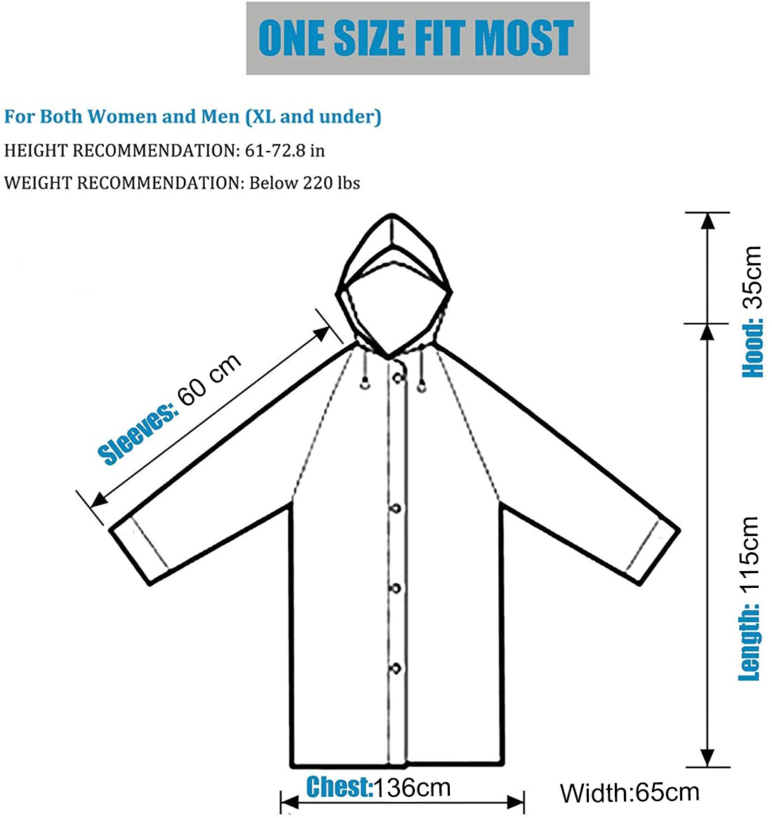 Deze regenjas is een gemiddelde grootte, geschikt voor de meeste mensen