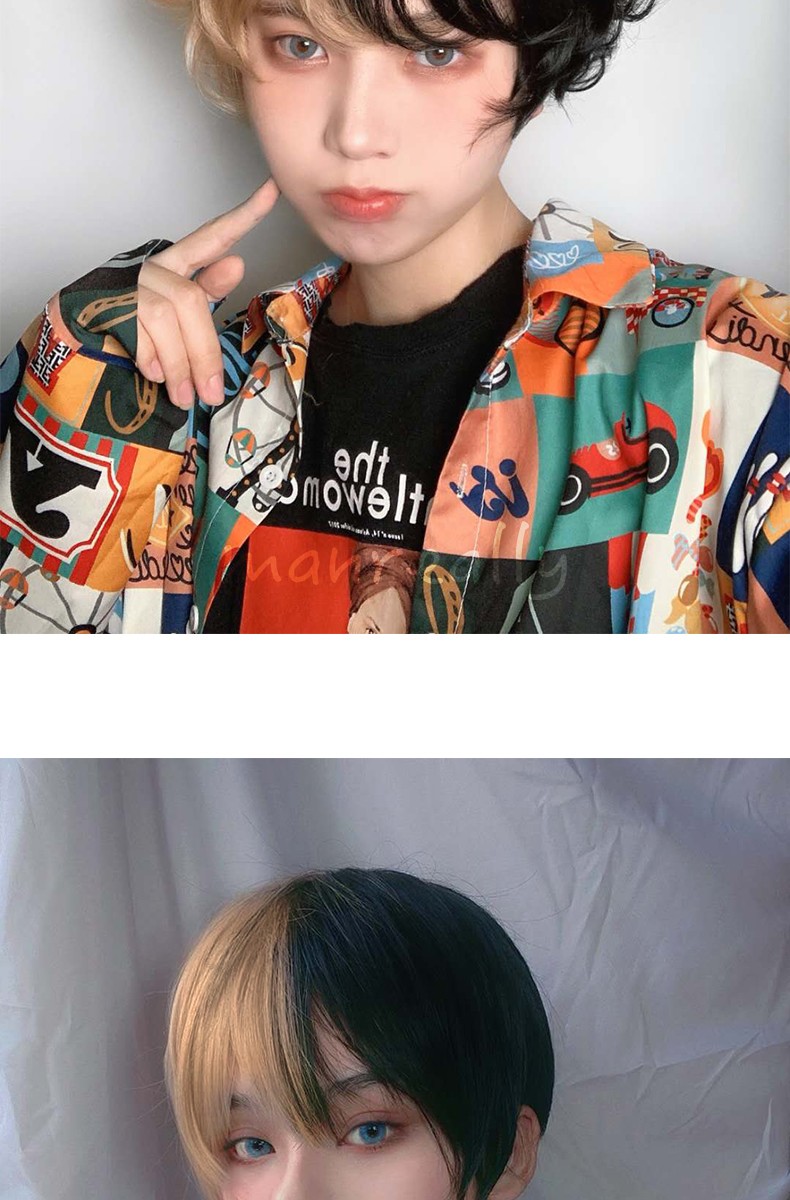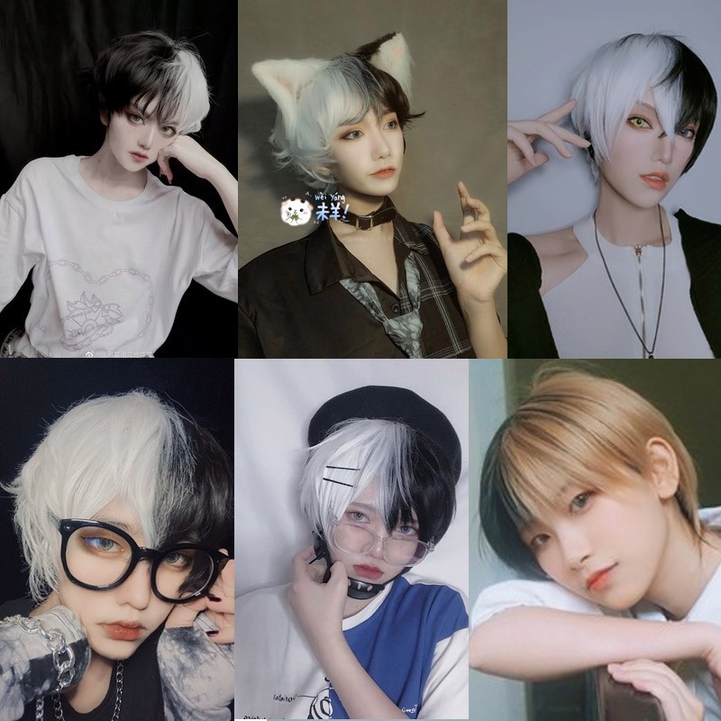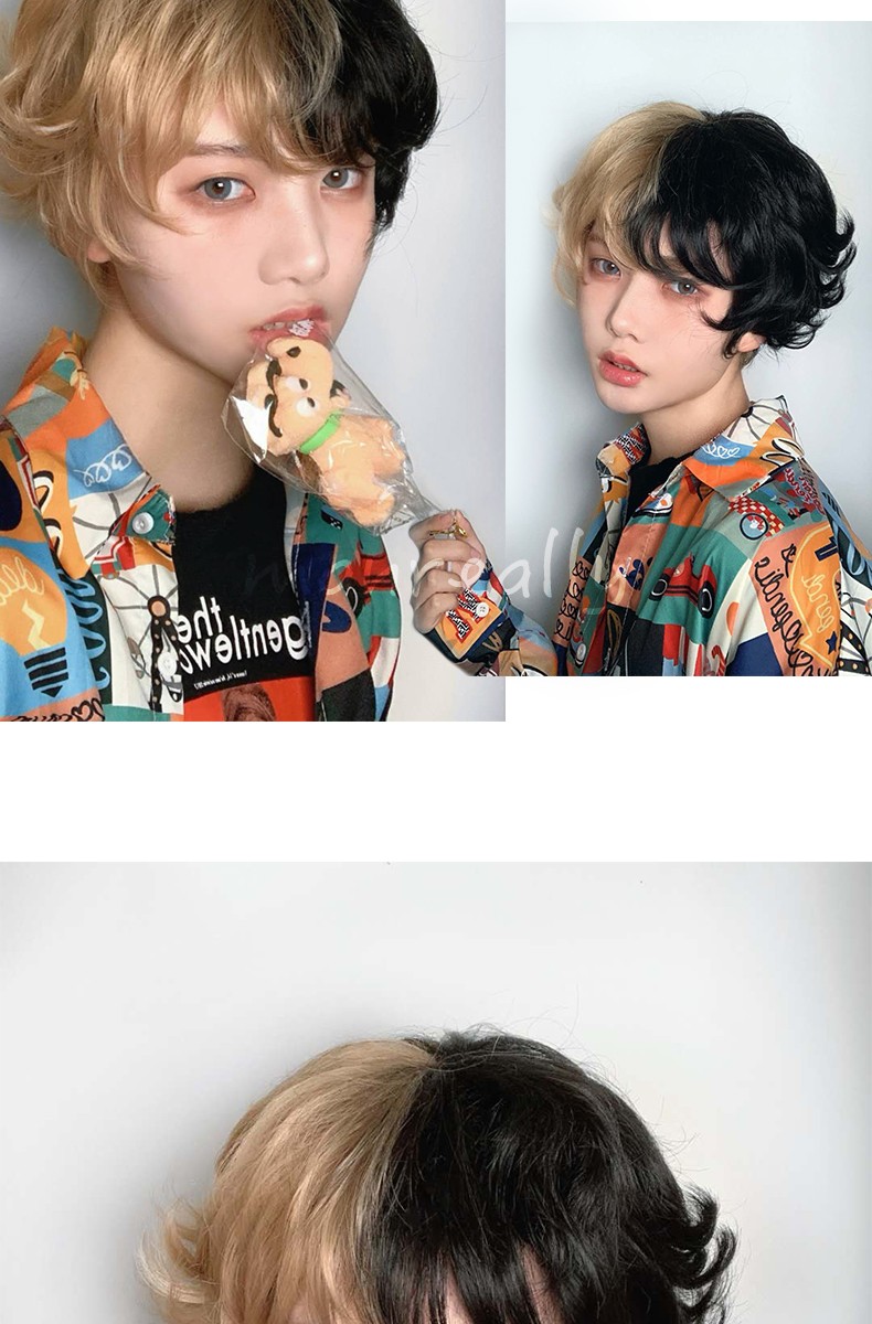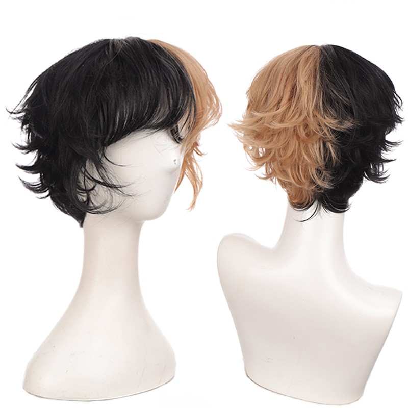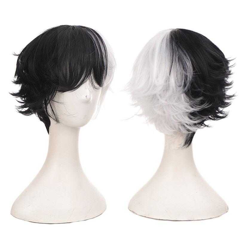 Kort Krullend Mannelijke Pruik Zwart Wit Geel Half Cosplay Anime Kostuum Halloween Pruiken Synthetisch Haar Met Pony Voor Mannen Jongen Vrouwen