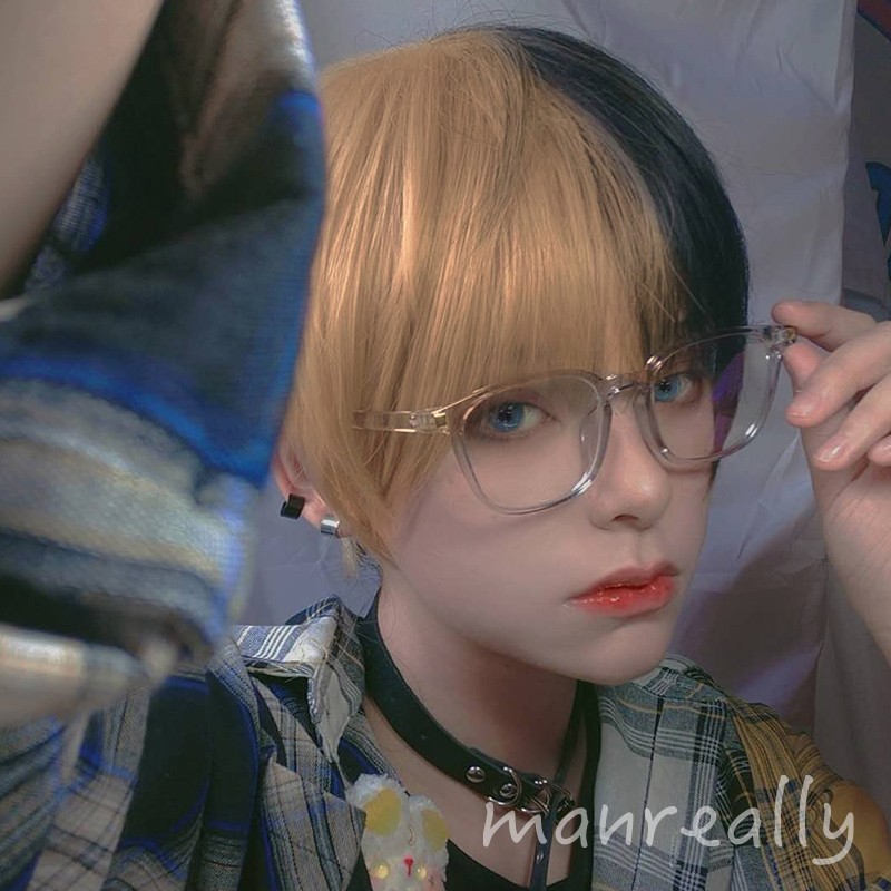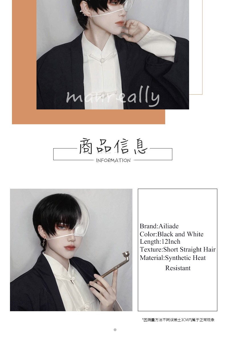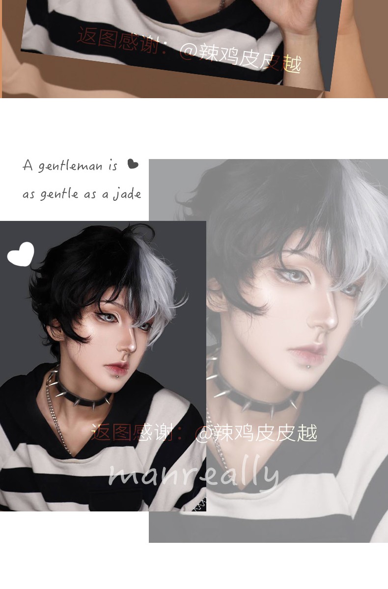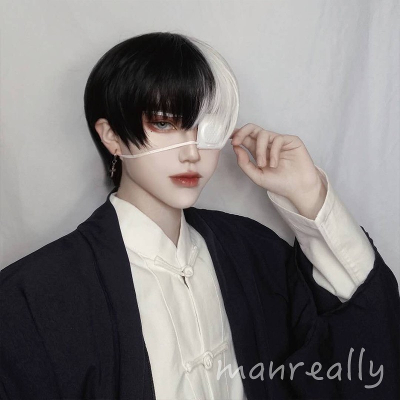 Kort Krullend Mannelijke Pruik Zwart Wit Geel Half Cosplay Anime Kostuum Halloween Pruiken Synthetisch Haar Met Pony Voor Mannen Jongen Vrouwen