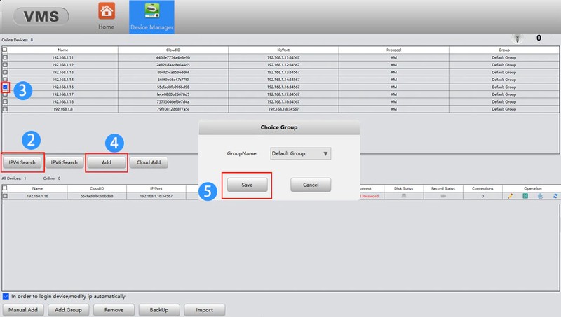 3. klik de Apparaat Manager-IPV4 Zoeken-kiezen adres van IP Camera- ADD-BESPAREN, zoeken en Camera succes;